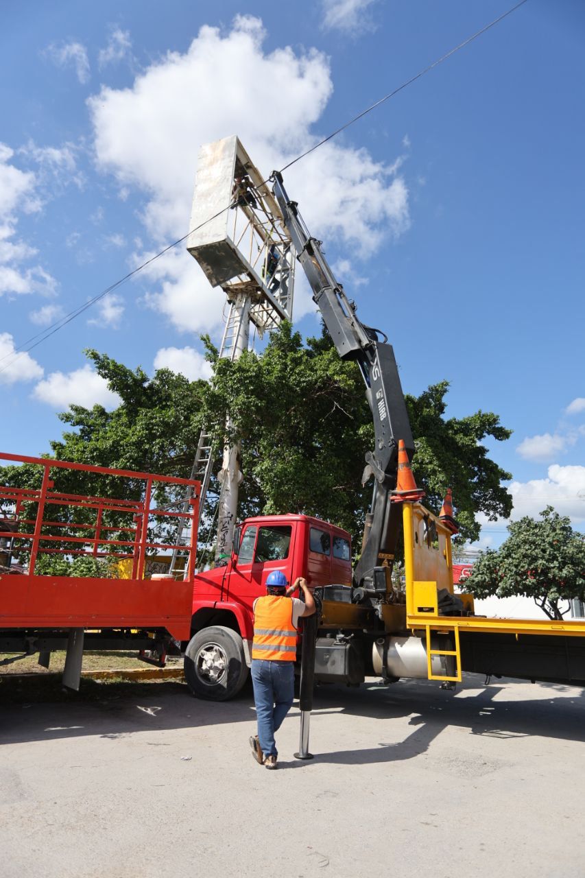 Como acto de autoridad, la Presidenta Municipal, Ana Paty Peralta; junto a diversos servidores públicos como el secretario general del Ayuntamiento, Pablo Gutiérrez; la secretaria municipal de Ecología y Desarrollo Urbano, Nahielli Orozco Lozano; la directora de Imagen Urbana, Margarita Jiménez Bonifaz y el titular de Protección Civil, Antonio Riveroll Ribbon; entre otros, supervisaron el desmontaje de uno los unipolares ubicados en el Blvd. Colosio.