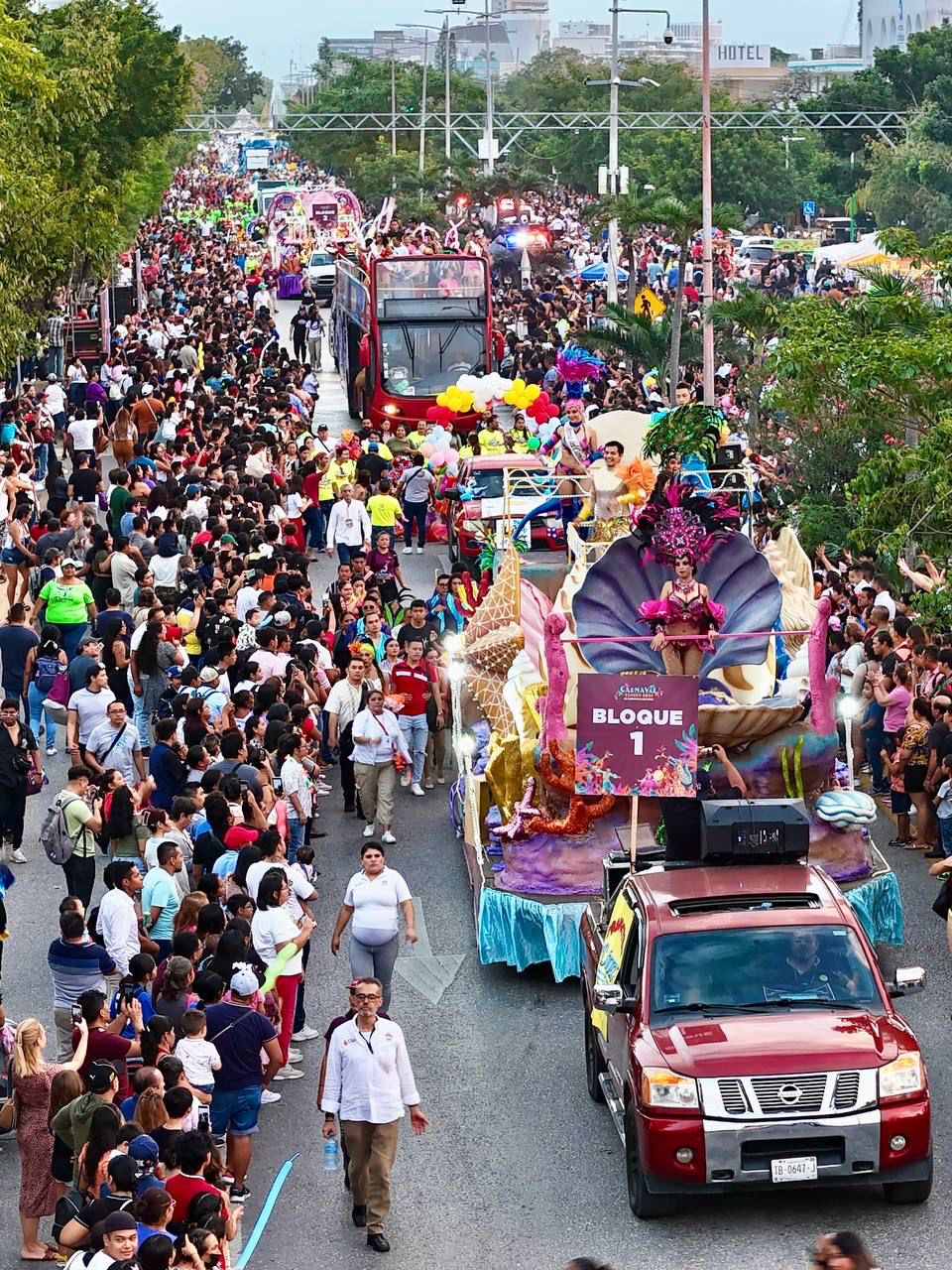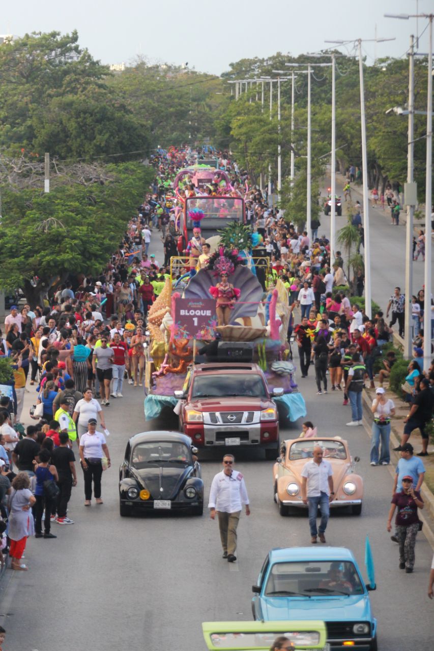 En el derrotero se pudo observar además los carros alegóricos participantes también en un certamen, los cuales lucieron diferentes motivos alusivos al carnaval, a la vida marina, al Caribe Mexicano o a las propias empresas que los representan, que además traían el sonido ambiente con melodías de merengue, salsa, reggaetón y ritmos caribeños para deleitar a grandes y pequeños.