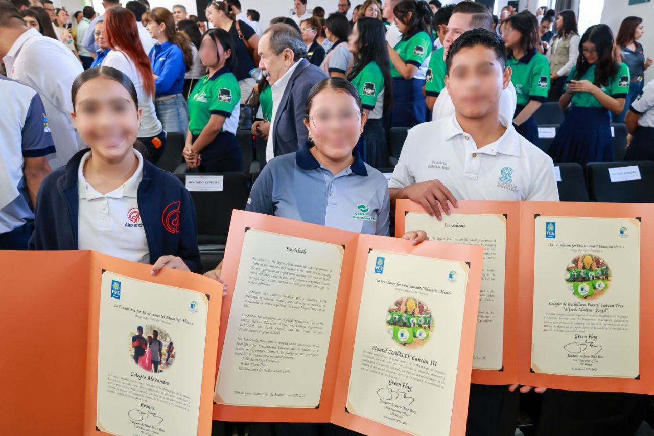 De esta forma, la Primera Autoridad Municipal otorgó el distintivo en la modalidad Nivel Green Flag (Bandera Verde), el más alto del programa, al CONALEP Plantel II y Plantel III, así como al Colegio Creativos, Colegio de Bachilleres Plantel Cancún 3 Bonfil y Colegio King David.