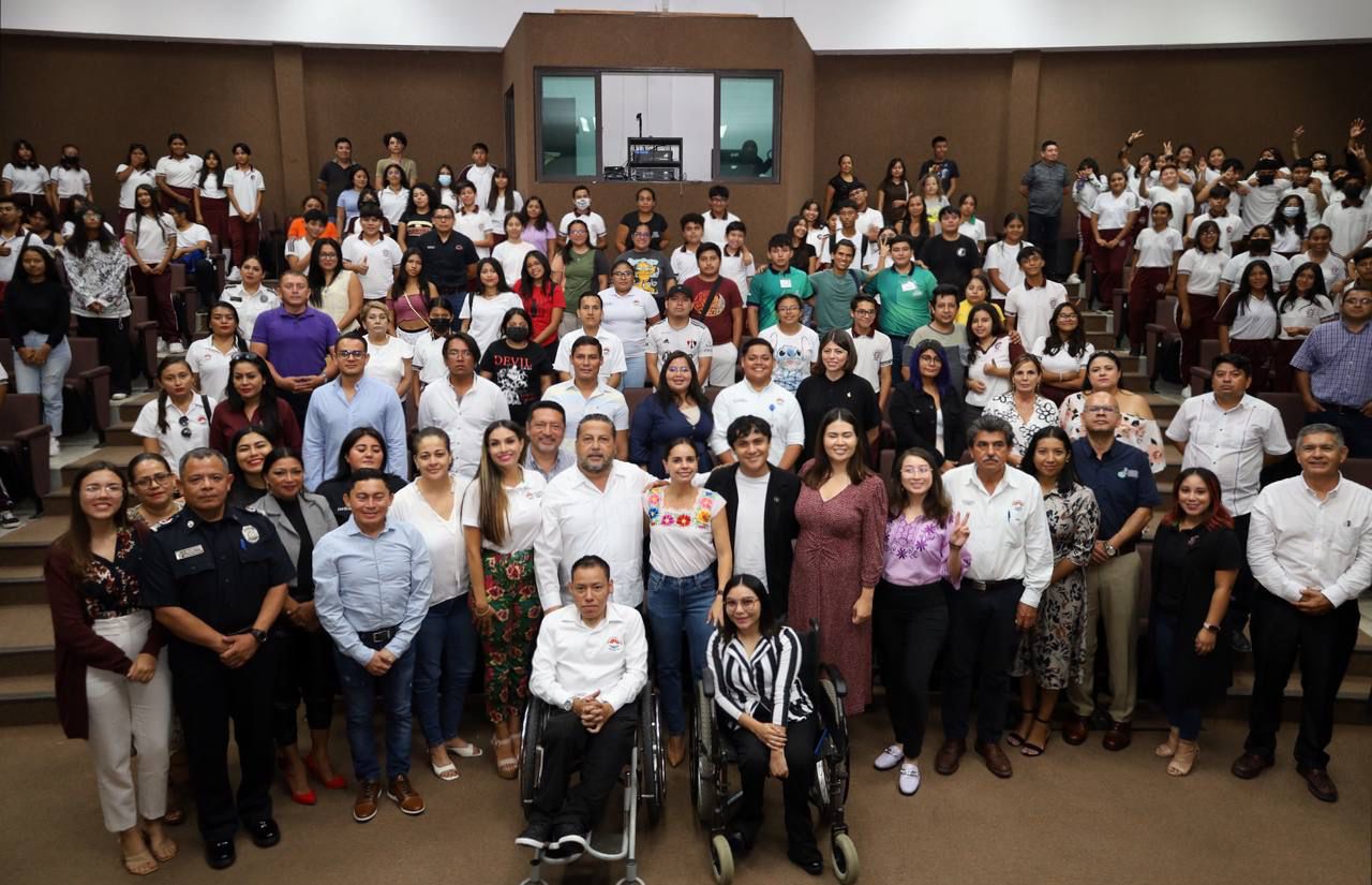 Alrededor de 200 jóvenes becarios de nivel medio superior y superior, recibieron a la Primera Autoridad en el Planetario Cancún Ka’Yok’, quien los saludó emocionada por formar parte del foro social, donde se desarrollaron diferentes temas alusivos a los derechos humanos universales.