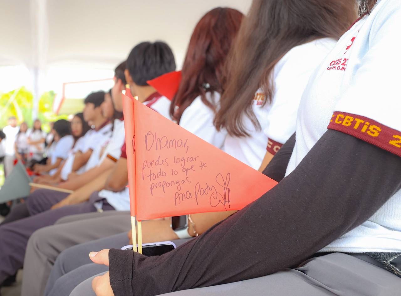 Primeramente, acudieron al Centro de Bachillerato Tecnológico Industrial y de Servicios (CBTIS) No. 272, que fue beneficiado con la construcción y equipamiento de cinco aulas didácticas que amplía la cobertura a 1,160 alumnos en el turno matutino y vespertino.