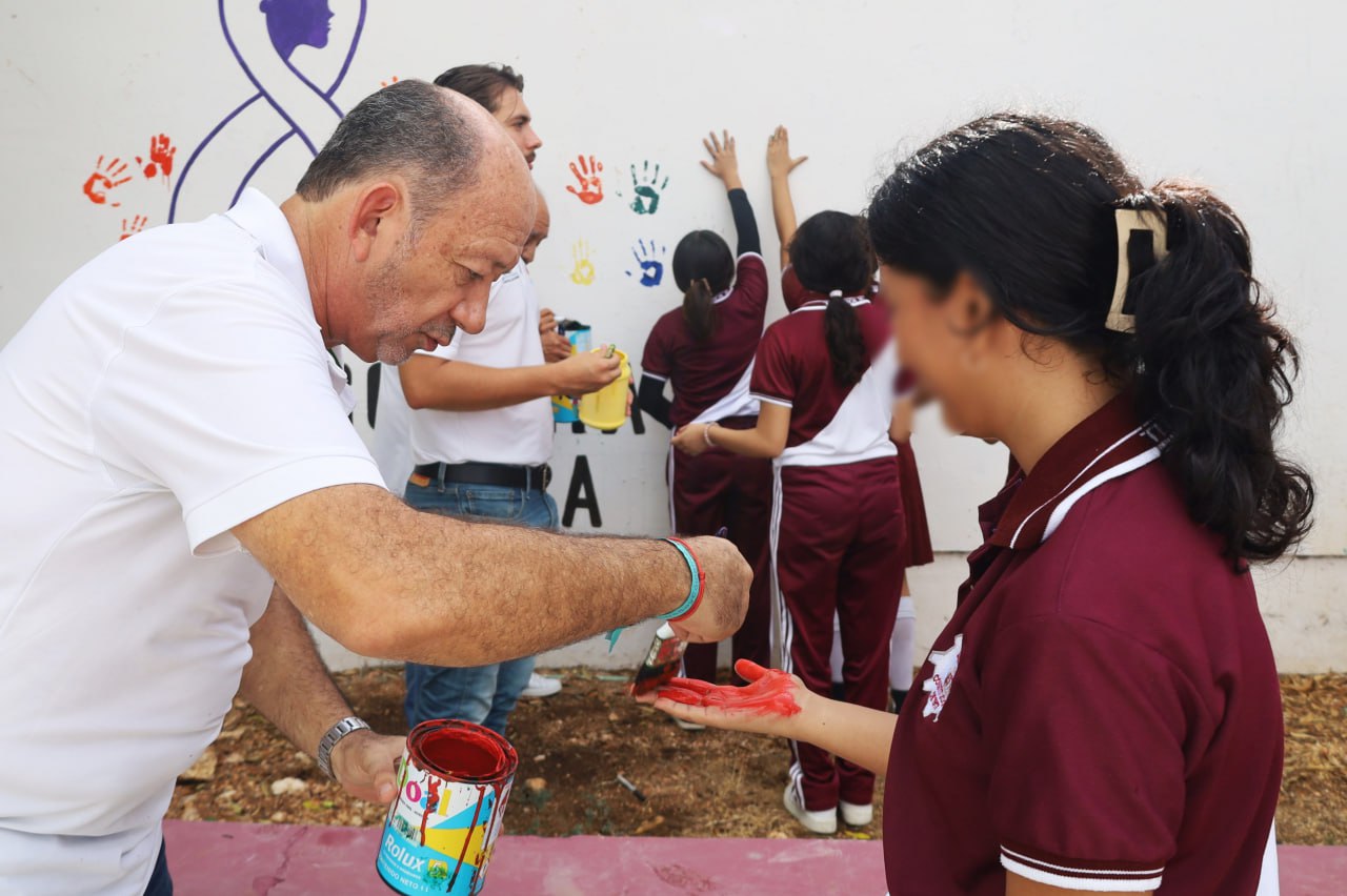 Posteriormente, las y los estudiantes acompañaron a las autoridades a plasmar sus huellas en el mural “Mis compromisos por la paz”, como parte de su compromiso a una salud digna para coartar las brechas de desigualdad.