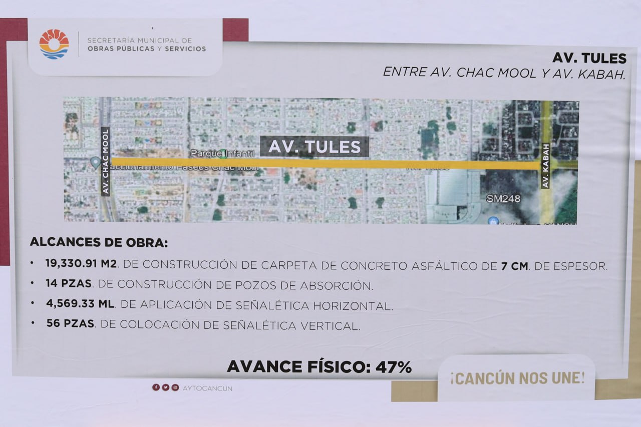 los trabajos de reconstrucción de pavimento en Avenida Tules, entre Avenida Chac