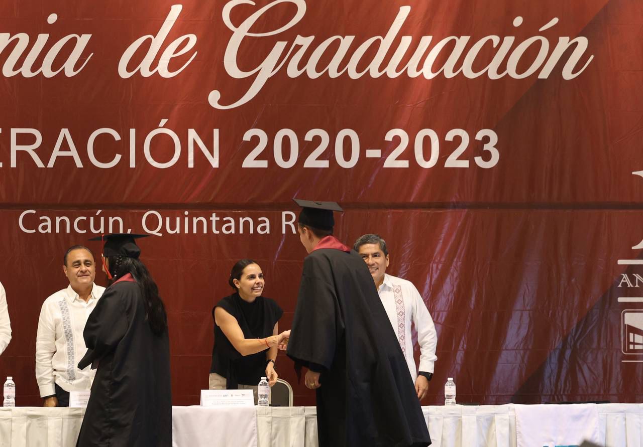 “Los admiro por estar aquí, porque cada uno de ustedes han pasado momentos complicados y retos que hoy superan en su graduación; en el gobierno municipal seguiremos trabajando todos los días sin descanso por los jóvenes, porque confiamos en ustedes y sé que harán la diferencia”, comentó frente a egresados, padres de familia y seres queridos que se encontraban en el Centro de Medios y Convenciones del Colegio Boston de la Avenida Chichén Itzá.