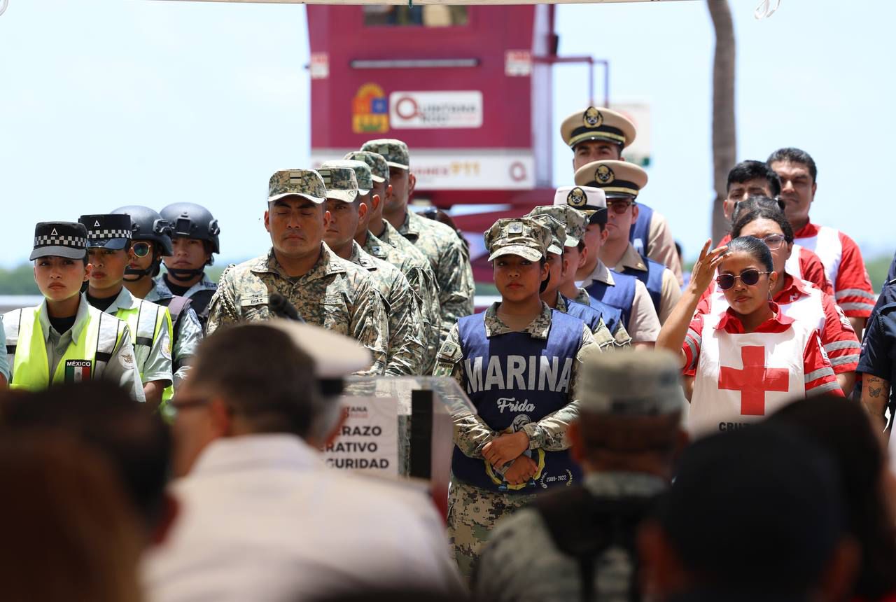 Asistieron también el comandante de la IX Región Naval en la entidad, Almirante Abraham Eloy Caballero Rosas; el coordinador general de la Guardia Nacional de Quintana Roo, General Brigadier Israel Noe Castillo Pérez; el comandante de la Guarnición Militar, General Brigadier David Morales Hernández; los secretarios estatales de Gobierno y de Turismo, María Cristina Torres Gómez y Bernardo Cueto Riestra, respectivamente; el delegado federal de Programas para el Desarrollo en Quintana Roo, Arturo Abreu Marín; el fiscal del Estado, Raciel López Salazar, entre otros invitados.