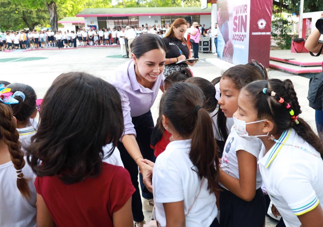 Cancún, Q. R., a 12 de junio de 2023.- Al participar en el homenaje cívico y una jornada del programa “Vivir sin acoso”, en la primaria “La Corregidora”, en la Supermanzana 228, la Presidenta Municipal, Ana Paty Peralta, motivó a niñas y niños a sumarse a actividades de reciclaje que pueden hacer desde casa o en su entorno escolar como elaborar ecoladrillos con residuos y convertirlos en bancas que puedan aprovechar en sus espacios de juego.