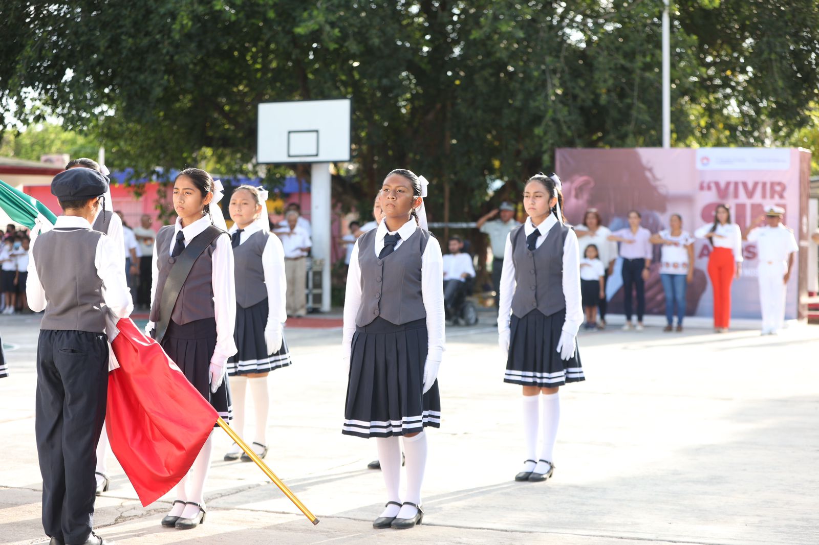 Luego de la entonación de los himnos Nacional Mexicano y de Quintana Roo, como parte del homenaje al Lábaro Patrio, la Primera Autoridad Municipal destacó que estas actividades permiten fortalecer valores e ideales que les hagan tener un desarrollo óptimo no solo dentro del plantel sino en sus hogares.