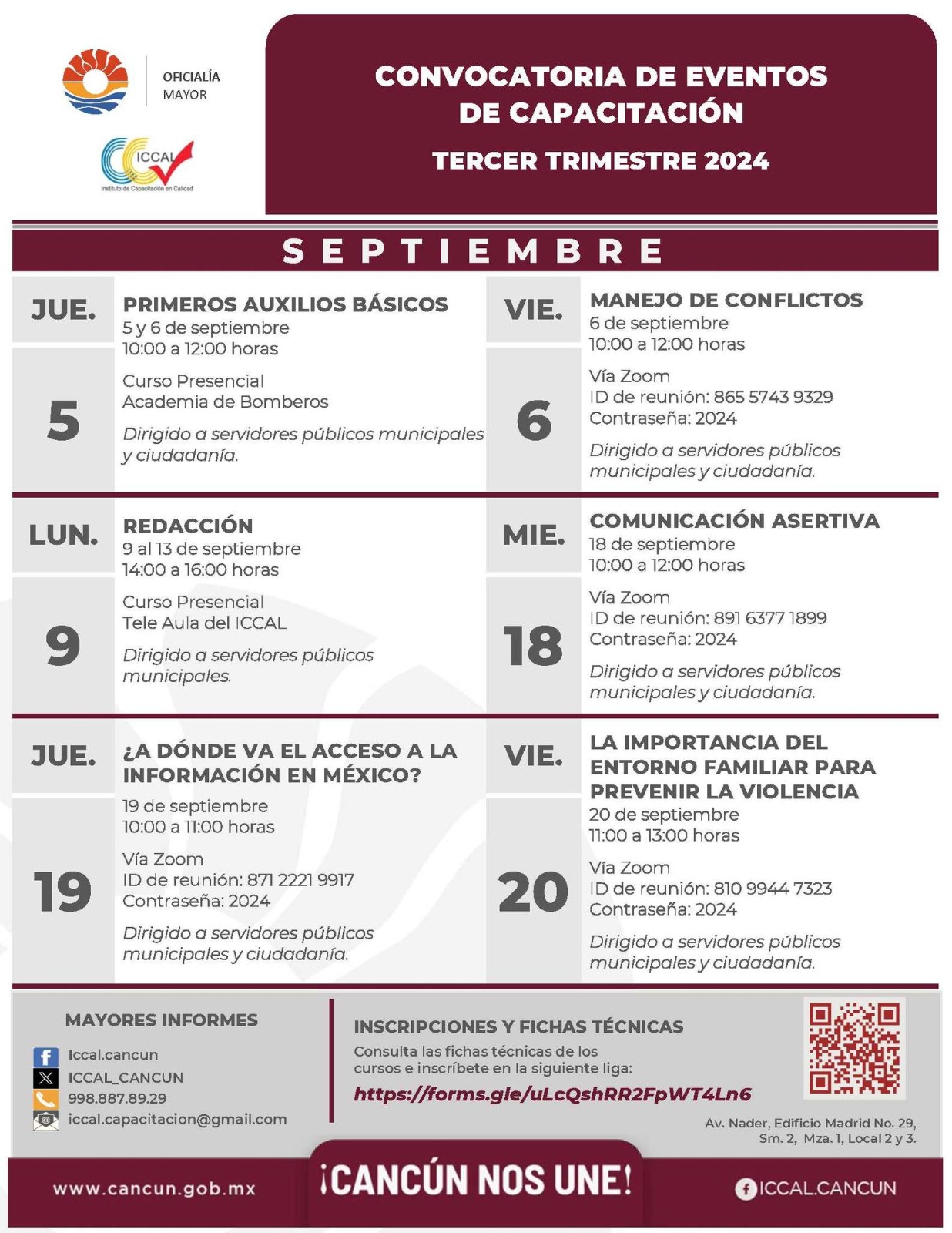 Cancún, Q. R., a 05 de septiembre de 2024.- El Ayuntamiento de Benito Juárez, a través del Instituto de Capacitación en Calidad (ICCAL) contempla diferentes cursos gratuitos en la primera parte de septiembre para abordar temas de interés general en los ciudadanos como la comunicación, manejo de conflictos o prevención de la violencia.
