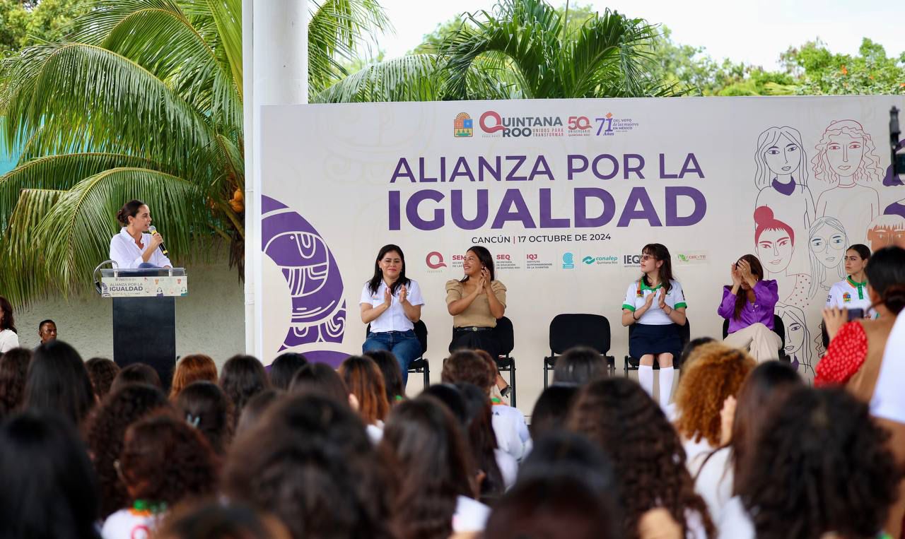 En su participación Esther Burgos Jiménez, secretaria de las Mujeres, dijo que por primera vez se implementó un mecanismo de participación democrática de la mano con el IEQROO, el cual se efectuará en instituciones del nivel medio superior de todo el estado, tanto en el Colegio de Bachilleres, CONALEP y CECYTE. “El día de hoy inicia la Alianza por Igualdad en donde se visitará a cada uno de los municipios para realizar este ejercicio de escoger a seis mujeres estudiantes que conformarán esta red de embajadoras de la alianza. En esta se pretende llegar a más de 17 mil jóvenes mujeres en el estado”, comentó.
