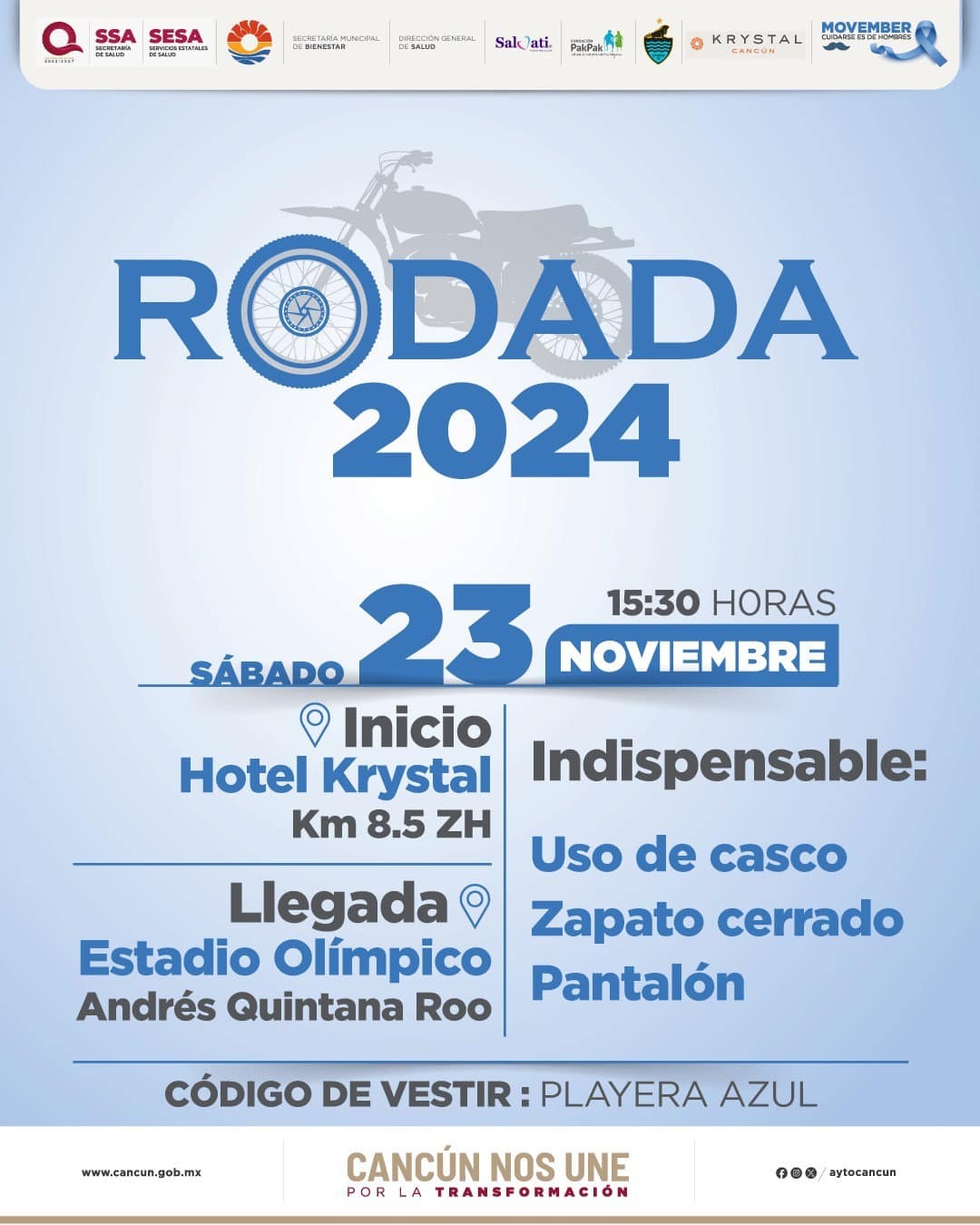 “La Rodada 2024” iniciará a las 15:30 horas, teniendo como punto de partida el kilómetro 8.5 de la Zona Hotelera, frente al hotel Krystal en el Km 8.5, hasta el Estadio Olímpico “Andrés Quintana Roo”, siendo indispensable que los participantes porten playera azul, casco protector, zapatos cerrados y pantalón.