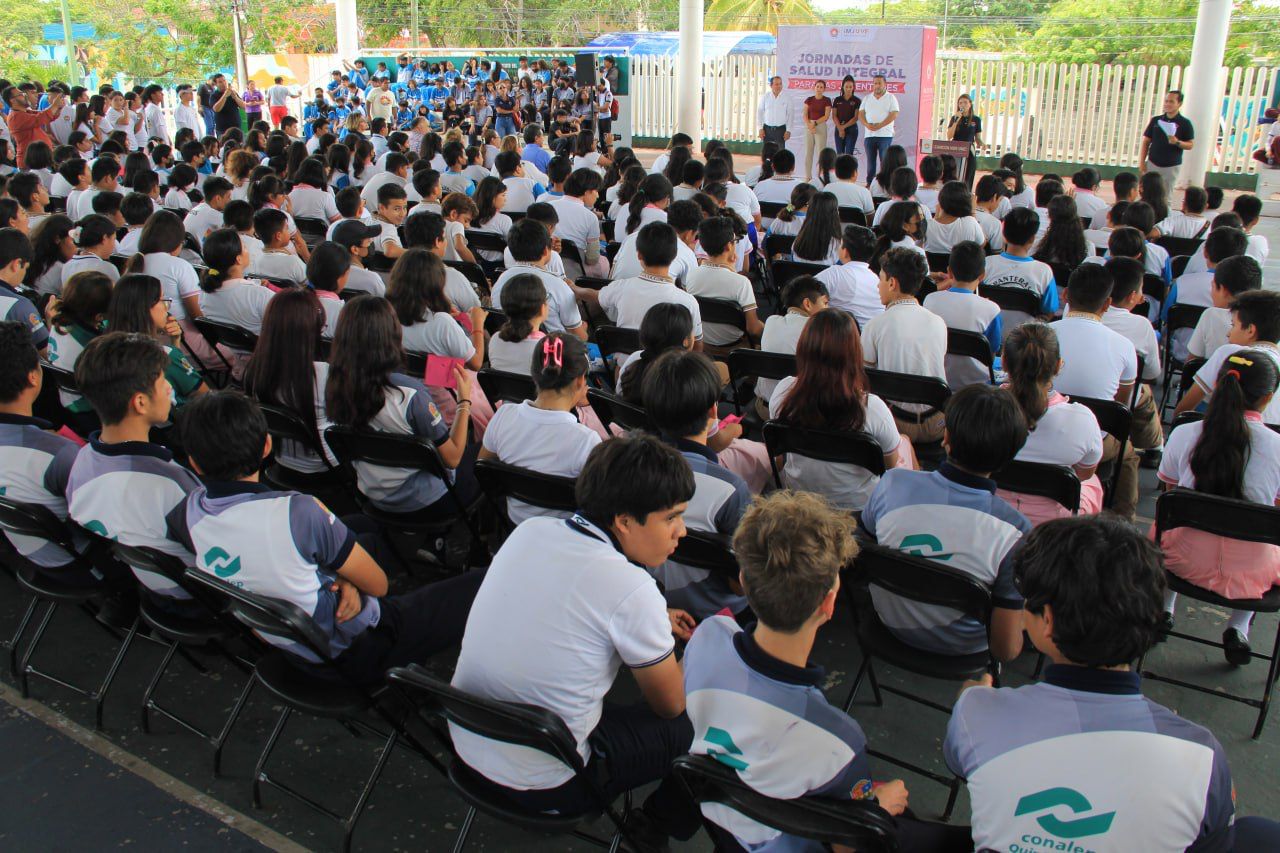 Cancún, Q. R., a 22 de junio de 2023.- Alrededor de 500 alumnos de secundarias y preparatorias en Cancún acudieron a la primer Jornada de Salud Integral para las Juventudes, realizada en el domo deportivo “Jacinto Canek”, en la cual tuvieron la oportunidad de saludar también a la Presidenta Municipal, Ana Paty Peralta, además de aprovechar diferentes módulos de asesoría y servicios médicos de varias instancias.