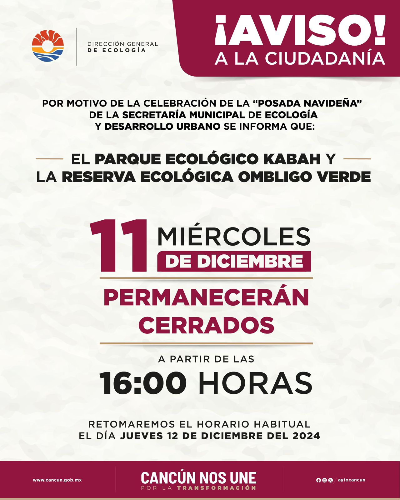 Cancún, Q. R., a 10 de diciembre de 2024.- La Secretaría Municipal de Ecología y Desarrollo Urbano del Ayuntamiento de Benito Juárez informó que el miércoles 11 de diciembre el Parque Ecológico Kabah y la Reserva Ecológica del Ombligo Verde permanecerá cerrados a partir de las 16:00 horas, por motivo de la posada navideña de dicha dependencia.