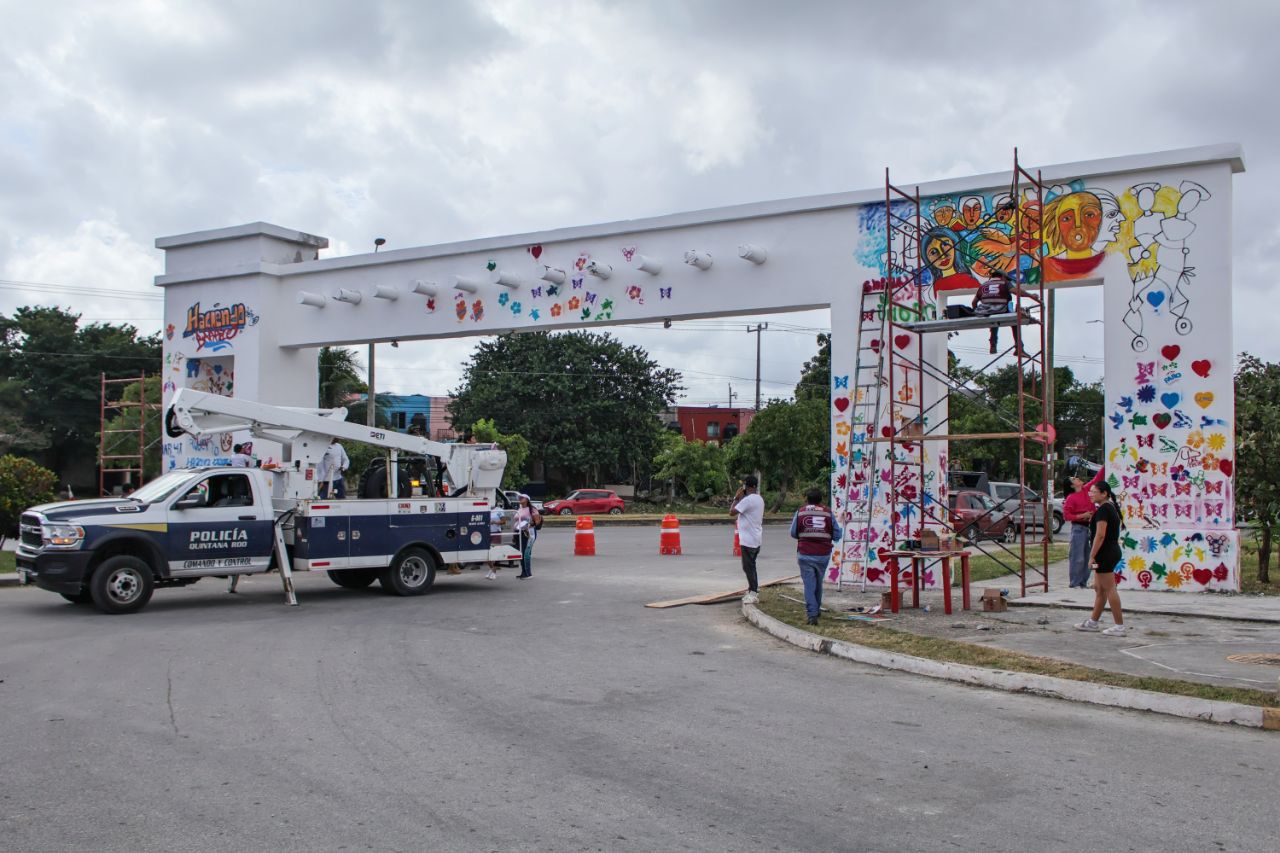 Cancún, Q. R., a 10 de diciembre de 2024.- Con la participación de decenas de niñas, niños, jóvenes y adultos, el Gobierno de Benito Juárez se sumó a la iniciativa del Gobierno de Quintana Roo, la Fábrica de Artes y Oficios (FARO) y la ONUDC de pintar los arcos de Villas Otoch Paraíso, que se desarrolló además con diversas actividades culturales para crear comunidad entre los vecinos de la zona.