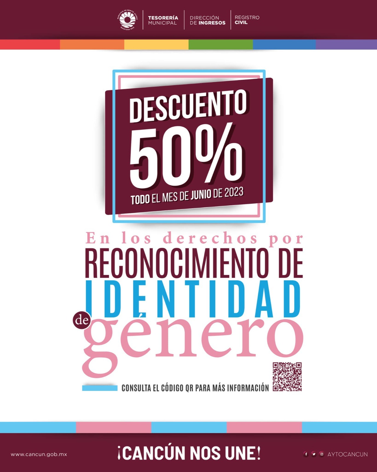 Cancún, Q. R., a 24 de junio de 2023.- A fin de avanzar hacia una sociedad más justa equitativa, igualitaria y feliz, el Ayuntamiento de Benito Juárez, que encabeza la Presidenta Municipal, Ana Paty Peralta, a través de las direcciones de Tesorería, Ingresos y Registro Civil, otorgará 50 por ciento de descuento para el trámite de reconocimiento de identidad y género, desde el jueves 01 junio al viernes 31 de diciembre de 2023.