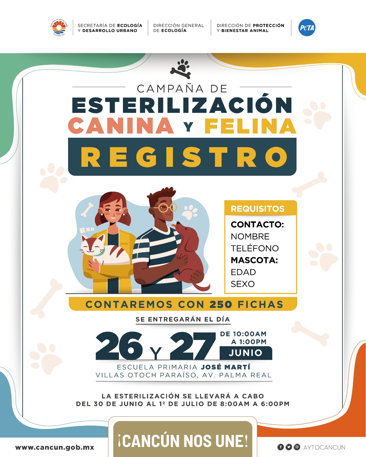 Dicha acción se llevará a cabo a través de la Dirección General de Protección y Bienestar Animal en la escuela primaria José Martí en Villa Otoch Paraíso, sobre la avenida Palma Real, donde personal de la dependencia antes mencionada, entregarán 250 fichas para esterilizaciones a perros y gatos, de 10:00 a 13:00 horas.