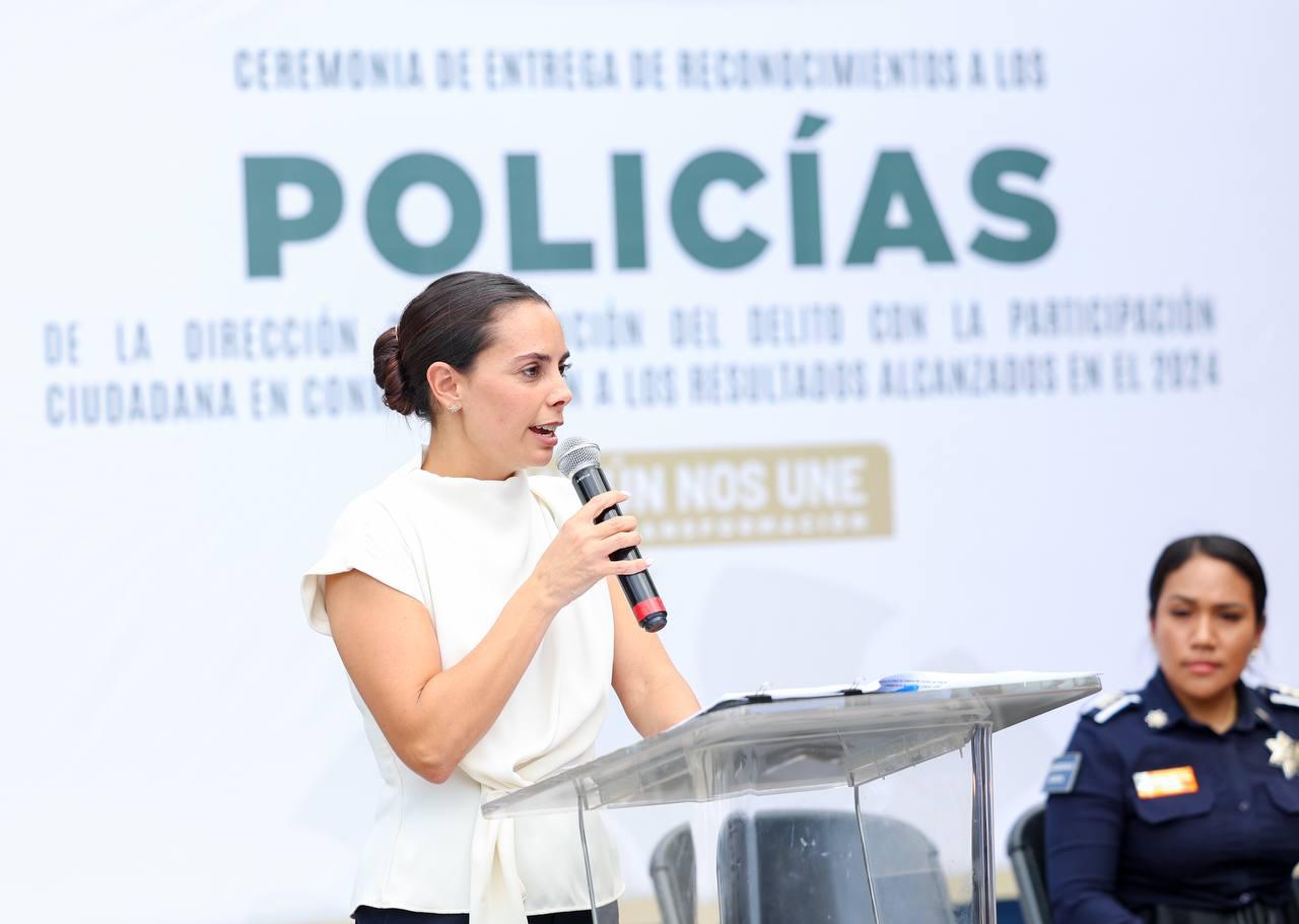 Cancún, Q. R., a 31 de enero de 2025.- La Presidenta Municipal, Ana Paty Peralta, entregó 35 reconocimientos al personal de la Dirección de Prevención del Delito con la Participación Ciudadana en conmemoración a los resultados alcanzados en el 2024, por su destacada labor y compromiso con la seguridad de las y los cancunenses, para que la comunidad viva en un entorno más seguro.