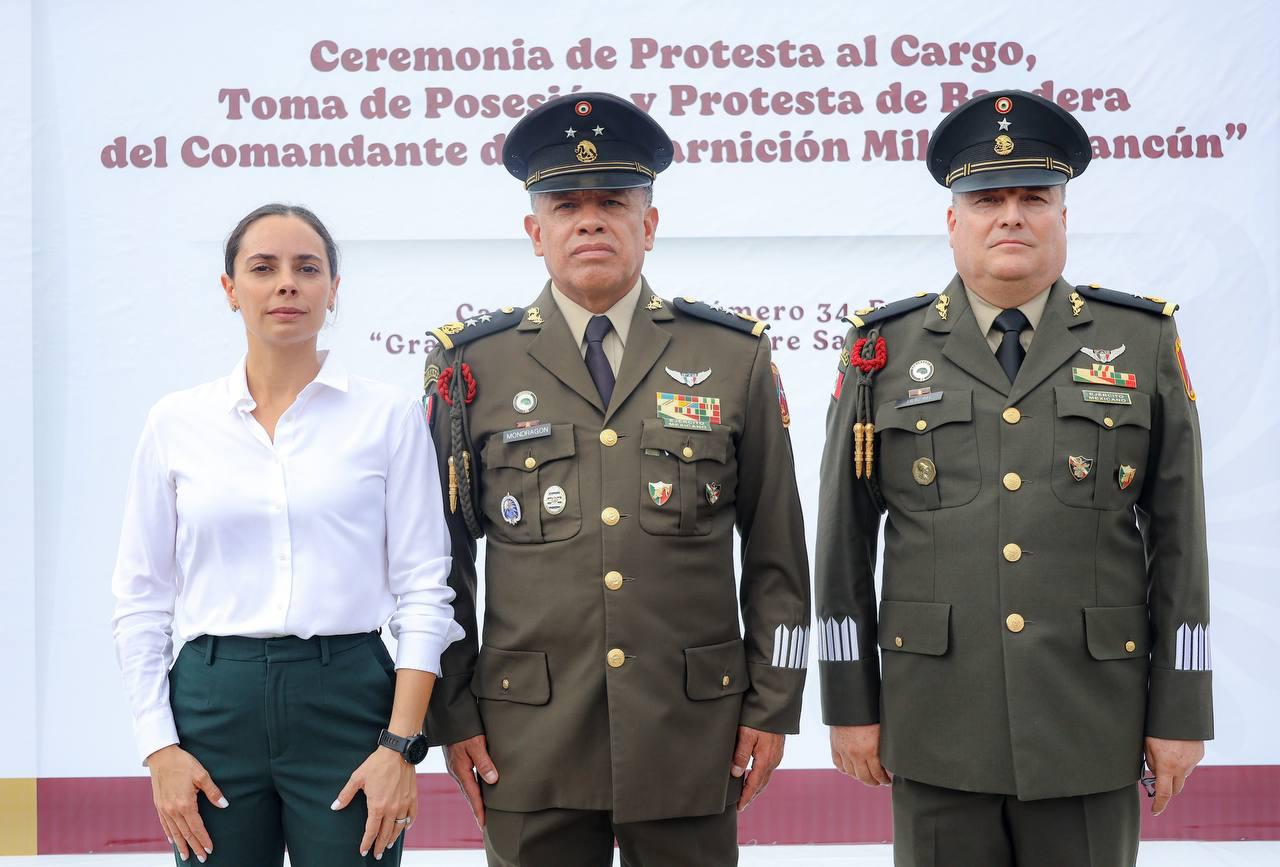 Cancún, Q. R., a 05 de febrero de 2025.- La Presidenta Municipal, Ana Patricia Peralta, atestiguó la protesta al cargo, así como toma de posesión y protesta de bandera al General Brigadier D. E. M., Claudio Edmundo Huizar de la Torre, como comandante de la Guarnición Militar de Cancún.