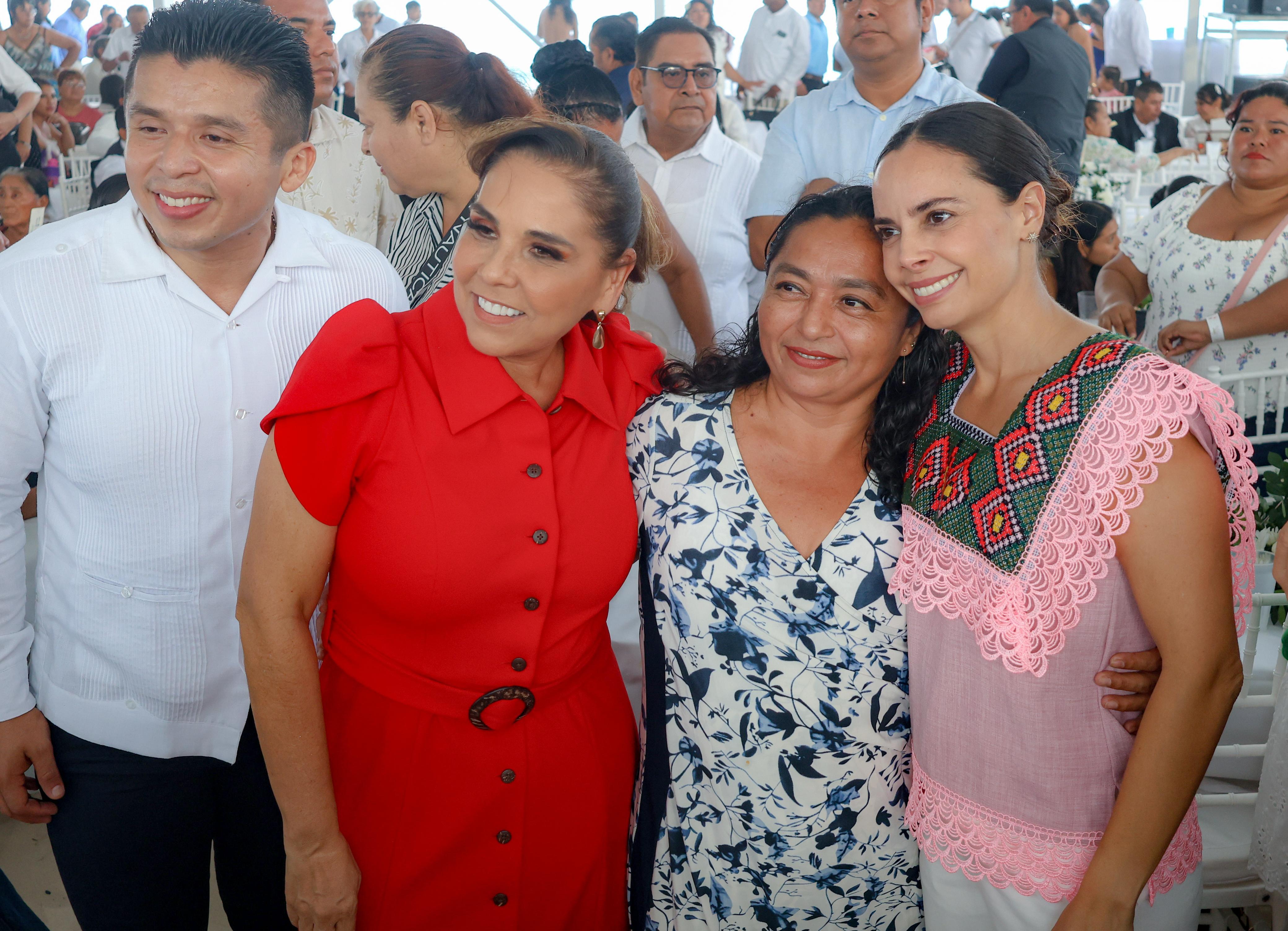 Cancún, Q. R., a 14 de febrero de 2025.- Bajo un atardecer espectacular, con el mar azul turquesa de fondo y en el marco del Día del Amor y la Amistad, la Presidenta Municipal, Ana Paty Peralta; la Gobernadora, Mara Lezama y la presidenta honoraria del DIF Quintana Roo, Verónica Lezama Espinosa, fungieron como testigos de honor en las Bodas Colectivas 2025 en la icónica Playa Delfines, donde 351 parejas cancunenses contrajeron nupcias en una ceremonia inolvidable.