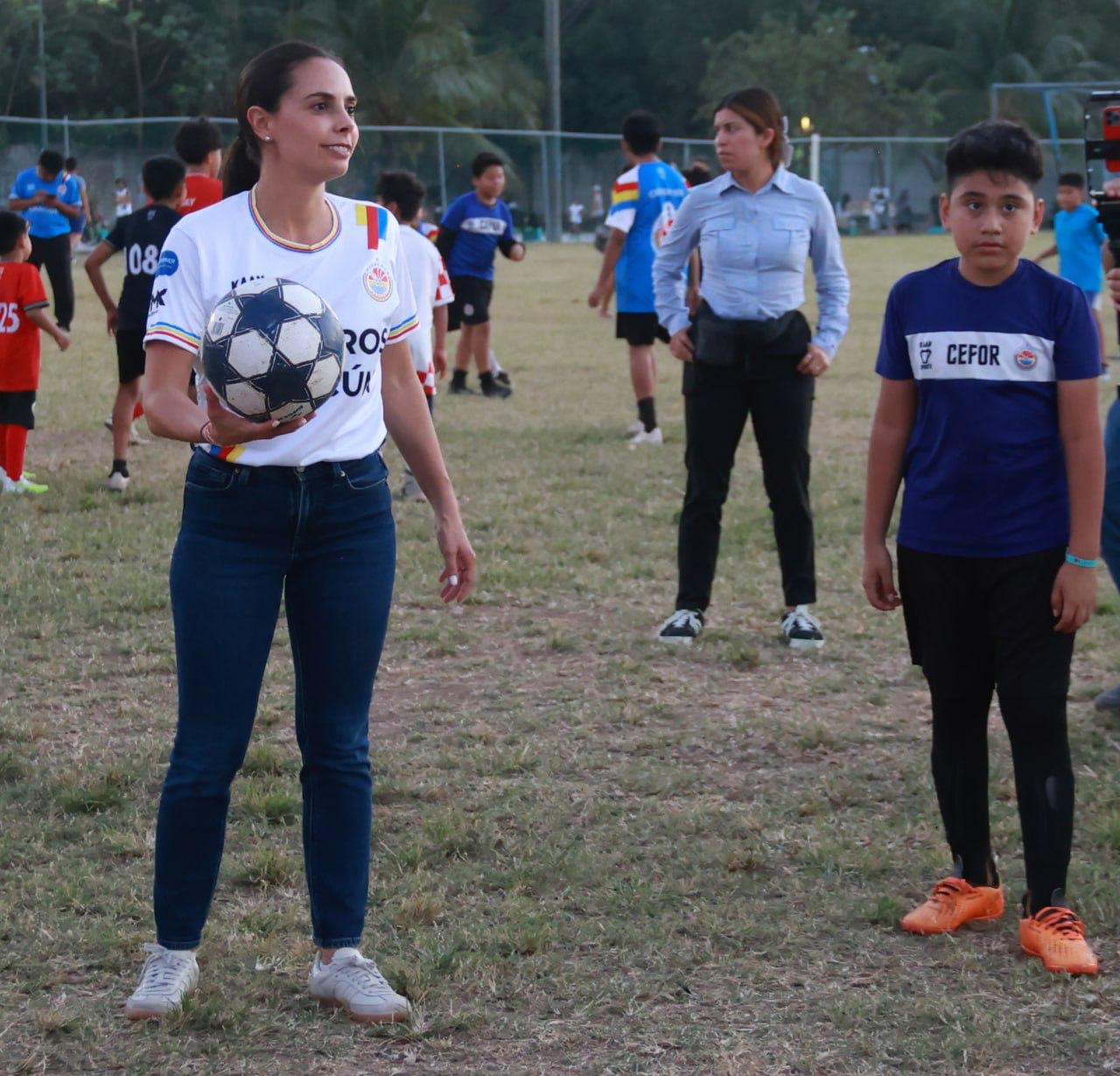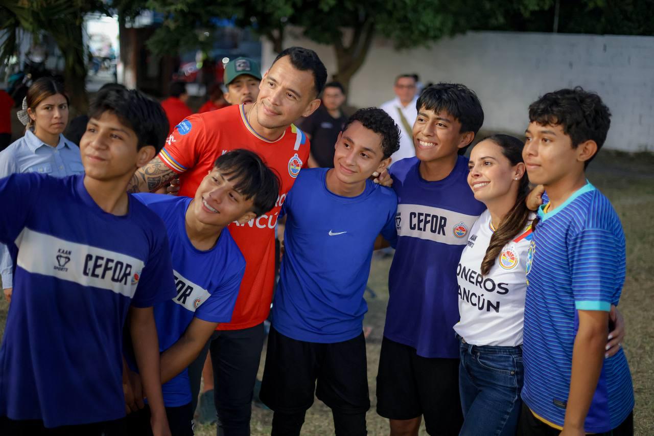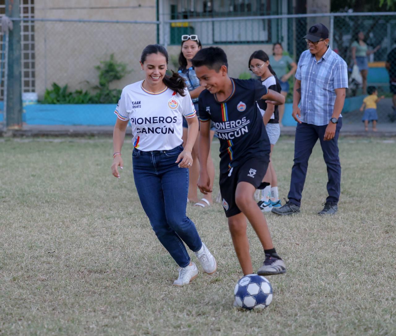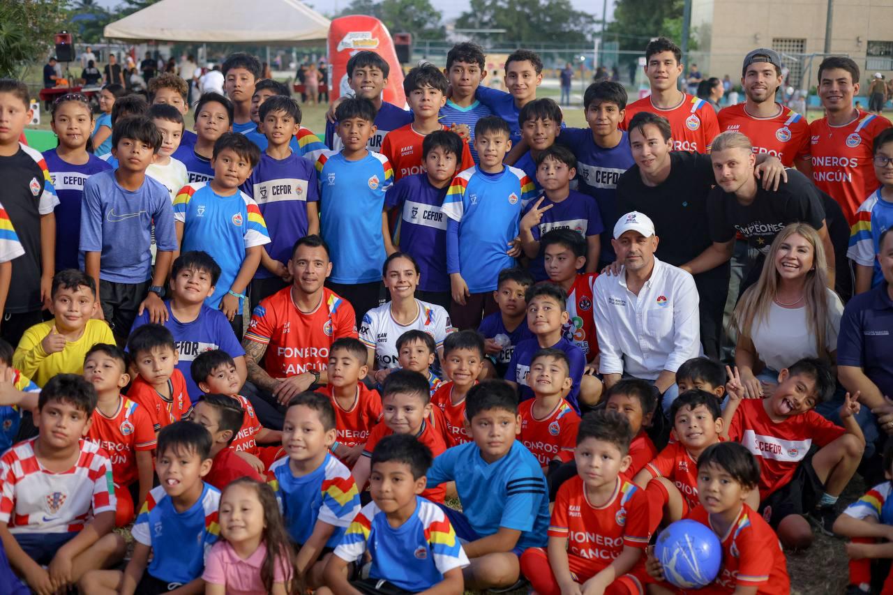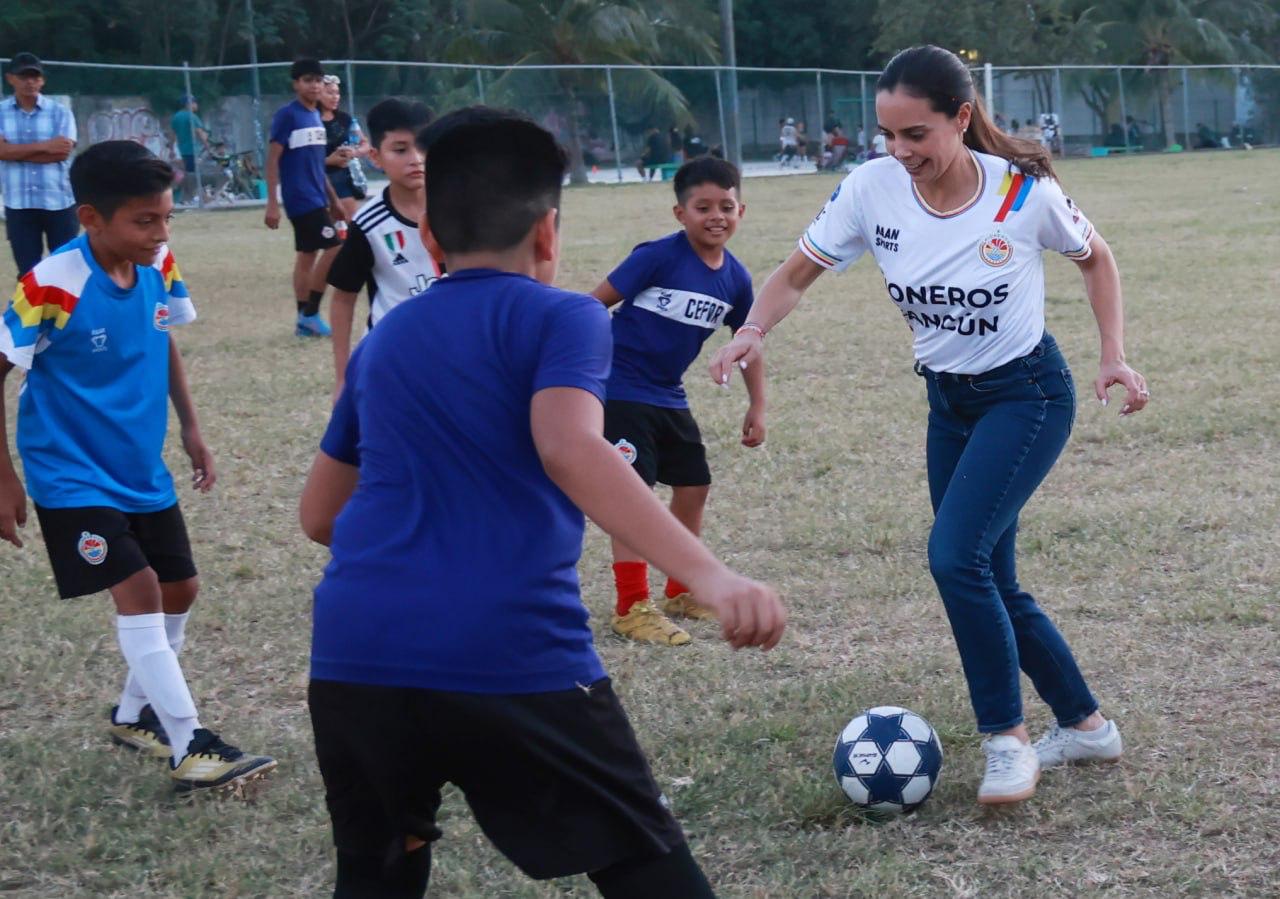Cancún, Q. R., a 18 de febrero de 2025.- Con el compromiso de promover entre niñas, niños y jóvenes cancunenses la salud y la activación física, así como la prevención de las violencias y las conductas autodestructivas, la Presidenta Municipal, Ana Paty Peralta, se integró al programa “El futbol nos une, todos por la paz” en la Supermanzana 101.