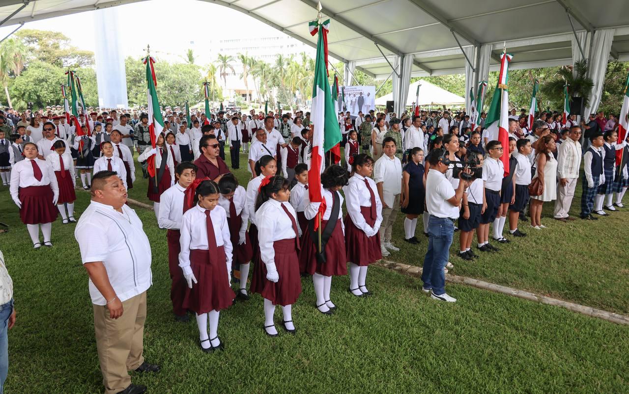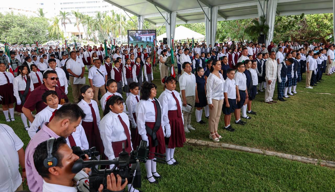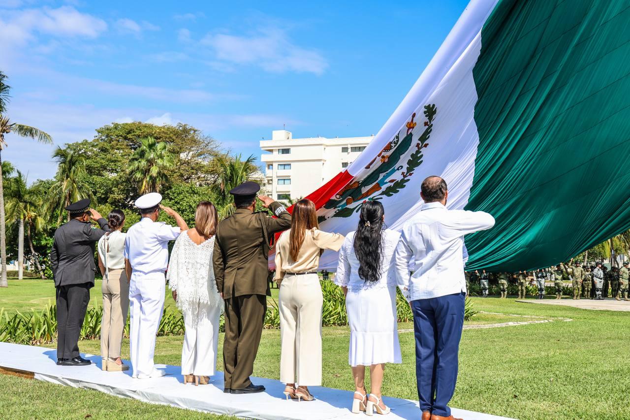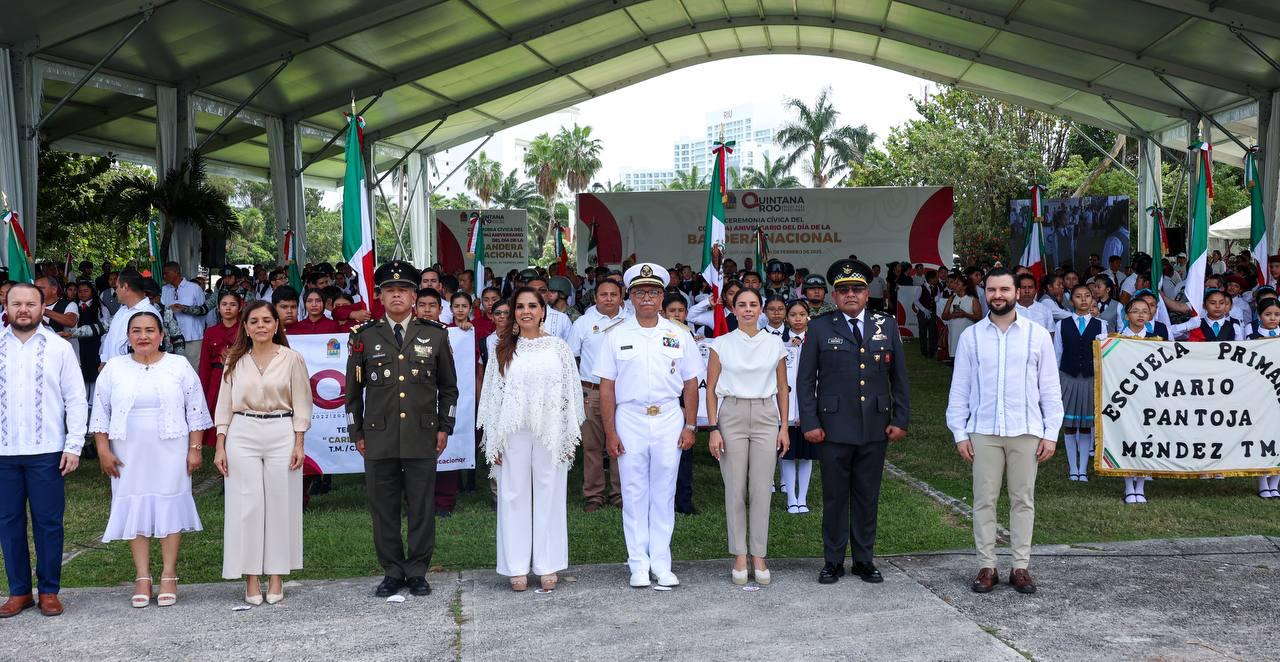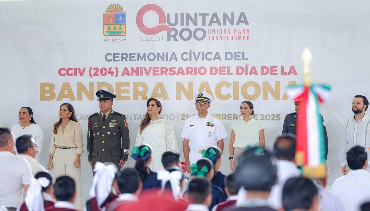 En el marco de la ceremonia cívica por el CCIV Aniversario del Día de la Bandera Nacional, en el Asta Bandera Monumental de la zona hotelera, ubicada en el kilómetro 5.5 del Boulevard Kukulcán, a la que asistieron estudiantes, fuerzas castrenses y servidores públicos, la Primera Autoridad Municipal resaltó la importancia de promover la difusión, conocimiento y respeto a los símbolos patrios, ya que en el Lábaro Patrio se resume la historia de Independencia, libertad, soberanía, democracia, paz y unidad del pueblo mexicano.