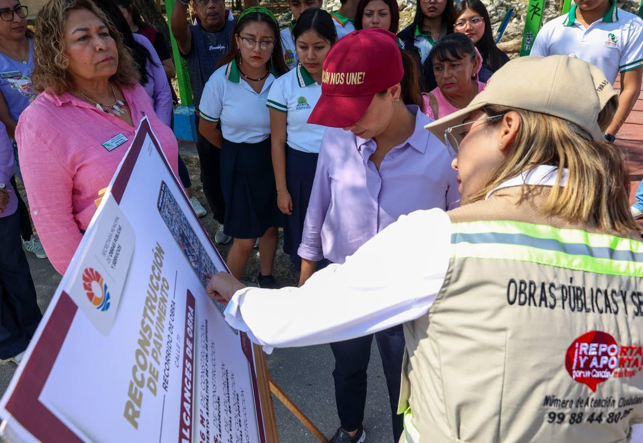 Cancún, Q. R., a 07 de marzo de 2025.- La Presidenta Municipal, Ana Paty Peralta, encabezó el recorrido de obra de la Reconstrucción de Pavimento en Calle 71, la cual se encuentra al 100 por ciento, la cual permite mantener una mejor circulación vial y seguridad para las y los estudiantes de la zona, al contar con un cruce peatonal cerca del del Colegio de Estudios Científicos y Tecnológicos (CECyTE) Cancún plantel I.