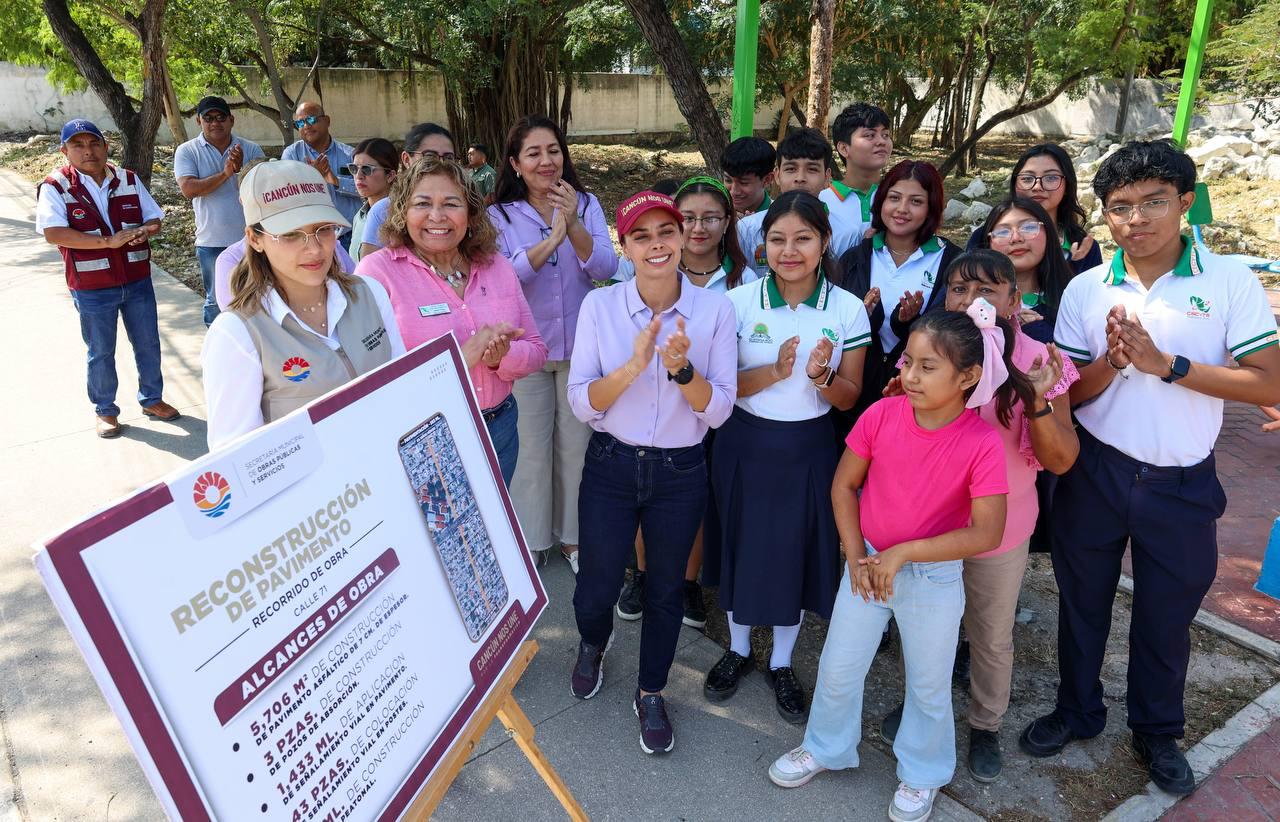 “Esta obra que es aproximadamente 500 metros lineales, son 10 cuadras las que abarca, tiene 3 pozos de absorción, empieza en la Av. Niños Héroes y termina en la calle 56 poniente. Esta Calle 71 era tan necesaria, porque estaba completamente dañada; estamos transformando nuestra ciudad, seguimos repavimentando, haciendo obras como nunca antes, es una inversión histórica para Cancún”, subrayó la Alcaldesa, ante los vecinos y estudiantes del CECyTE.