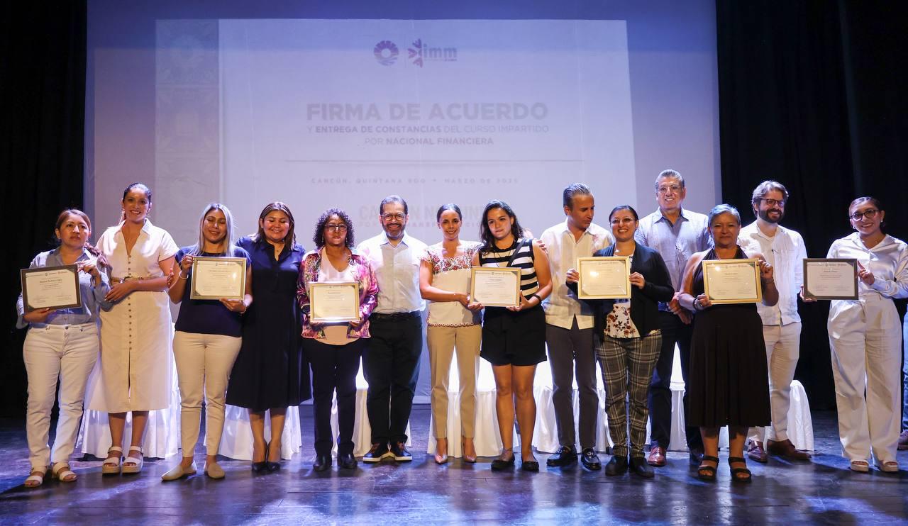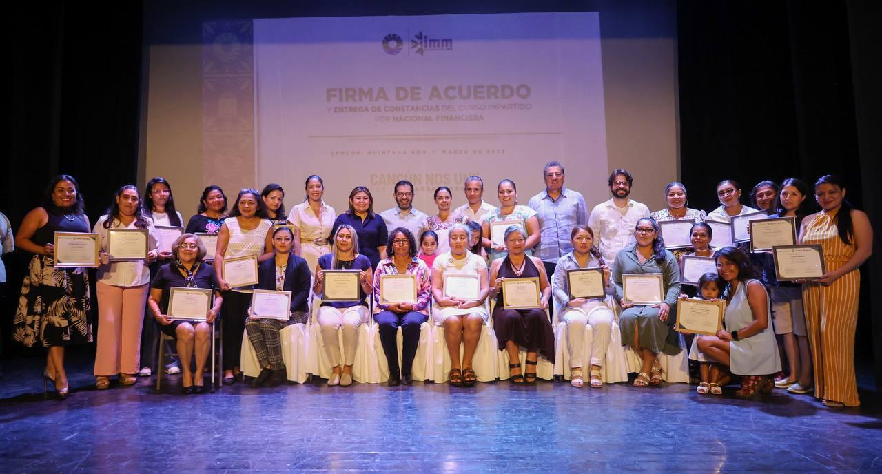 Cancún, Q. R., a 19 de marzo de 2025.- Además de entregar constancias por el curso impartido en beneficio de sus finanzas a través del programa “Ellas Facturan”, la Presidenta Municipal, Ana Paty Peralta, firmó un convenio de colaboración con Nacional Financiera (NAFIN), para seguir impartiendo asesorías que permitan impulsar a mujeres emprendedoras cancunenses y fortalecer la economía de Cancún.
