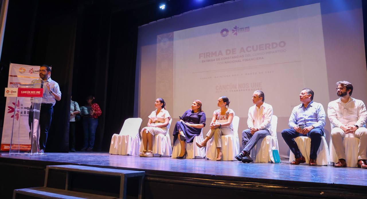 En el Teatro “8 de Octubre” en el que se dieron cita las féminas beneficiadas, Ana Paty Peralta firmó el convenio con el director general de NAFIN y del Banco Nacional de Comercio Exterior (Bancomext), Luis Antonio Ramírez Pineda, que por primera vez se realiza en Benito Juárez con el compromiso mutuo para impartir instrucción presencial o a distancia de manera gratuita para micro, pequeñas y medianas empresas, así como emprendedores.