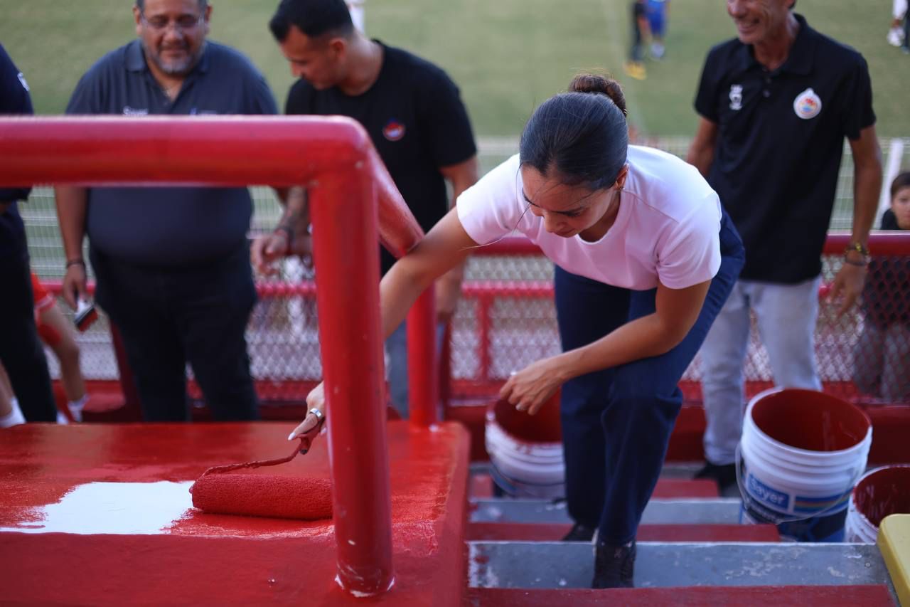 La actividad, señaló la Alcaldesa se realiza en el marco del compromiso por mejorar los espacios deportivos, la cual, reunió a jugadores y autoridades del Club Pioneros, encabezados por su vicepresidente, Daniel Arreola, así como invitados especiales y personal de la Dirección de Servicios Generales del municipio, quienes participaron en la aplicación de pintura en gradas, escaleras y bardas perimetrales del estadio, como parte de la primera fase del mantenimiento.