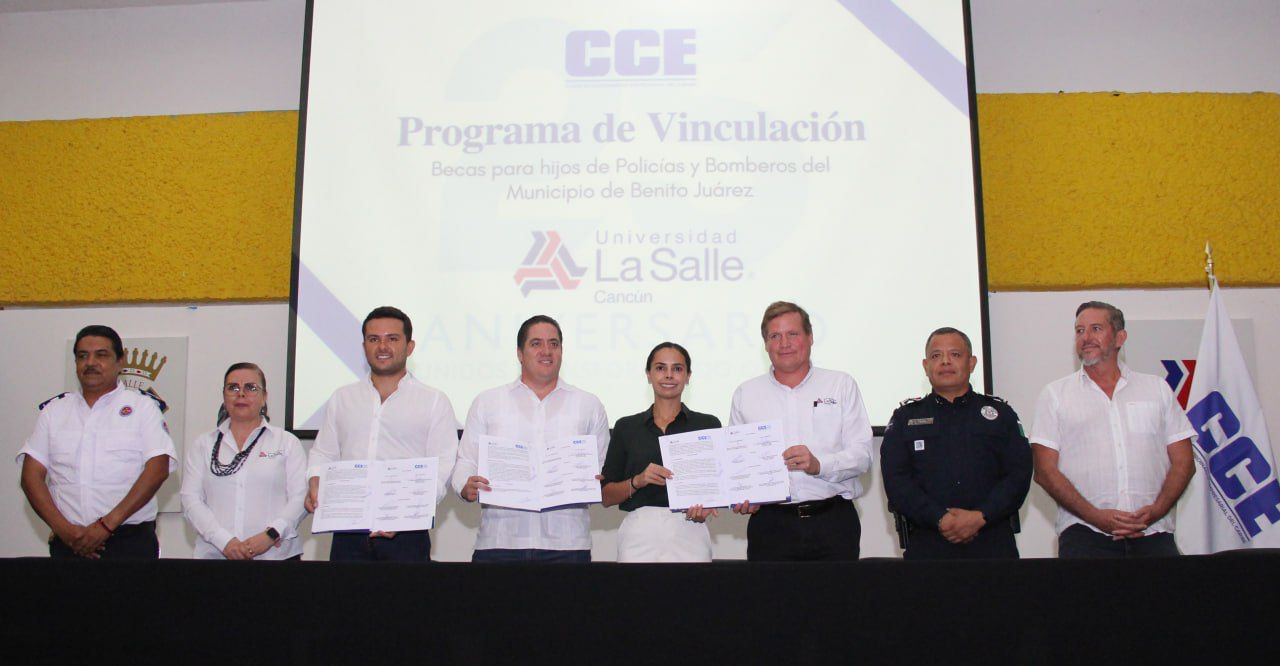 Por su parte, el presidente del Consejo Coordinador Empresarial del Caribe, Eduardo Martínez González, aseguró que en un esfuerzo por reconocer la labor de los elementos de la Secretaría de Seguridad Pública y el H. Cuerpo de Bomberos, se crea este programa de vinculación que permite cinco becas gratuitas a los hijos de los elementos de esas instituciones que se destaquen por su servicio.