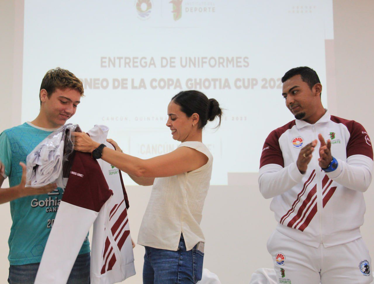 Cancún Q. R., a 06 de julio de 2023.- A fin de ofrecer identidad, uniformidad, presentación y como incentivo por su gran esfuerzo y dedicación, la Presidenta Municipal de Benito Juárez, Ana Paty Peralta, en compañía del director del Instituto Municipal del Deporte, Alejandro Luna López, realizó la entrega de uniformes a deportistas del equipo Leones Negros del Colegio Valladolid Fútbol Club, quienes representarán al municipio en el Torneo de la Copa Internacional Ghotia Cup 2023 que se llevará a cabo este mes en Suecia.