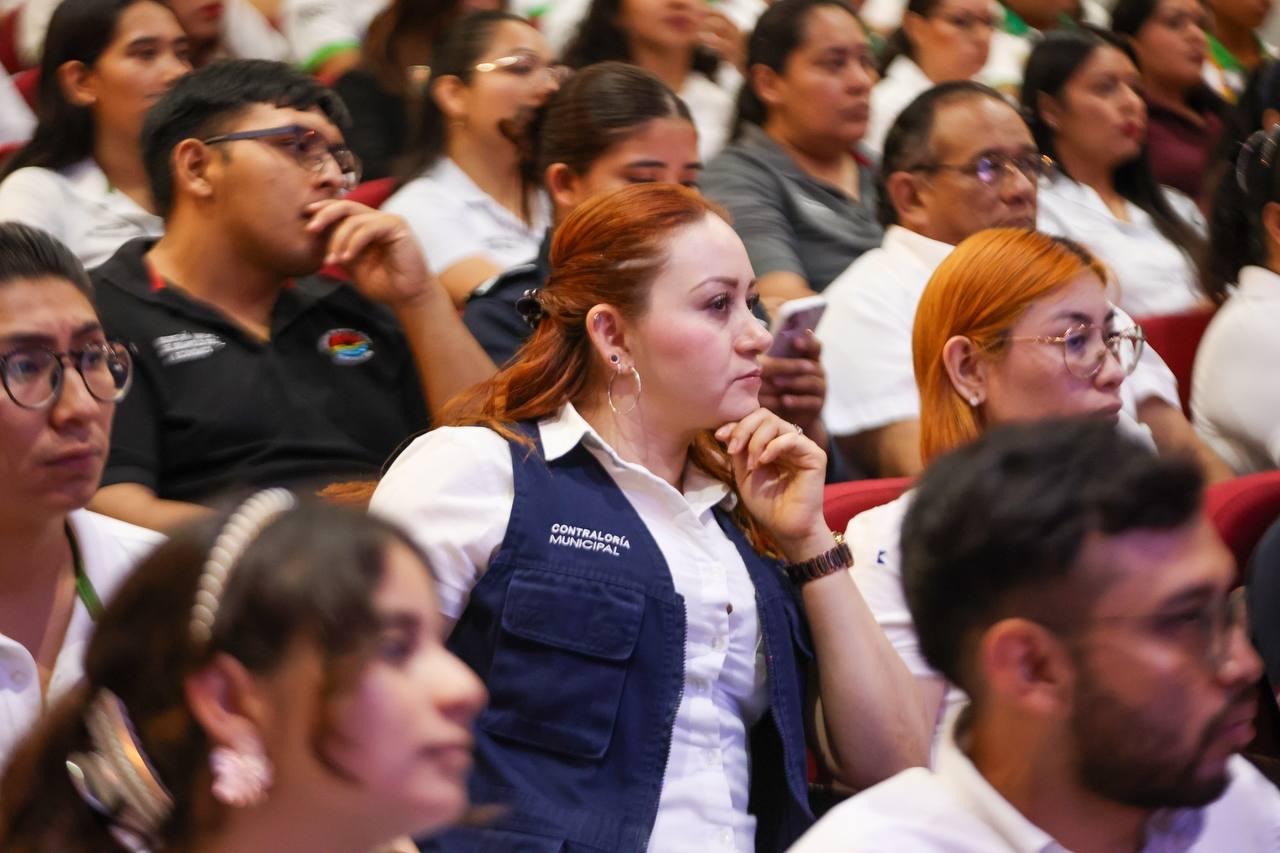 En el Teatro 8 de Octubre en el que se dieron cita enlaces de diferentes áreas de la administración así como estudiantes del Colegio de Estudios Científicos y Tecnológicos (CECyTE) Plantel II y de la Universidad UNIMAAT, la Primera Autoridad Municipal hizo un llamado a los colaboradores a sumarse a la campaña “Cero Corrupción”, a cargo de la Contraloría Municipal, que se rige por principios y prioriza que cada peso público, expediente o decisión deben ser cuidados para que beneficio de las personas.