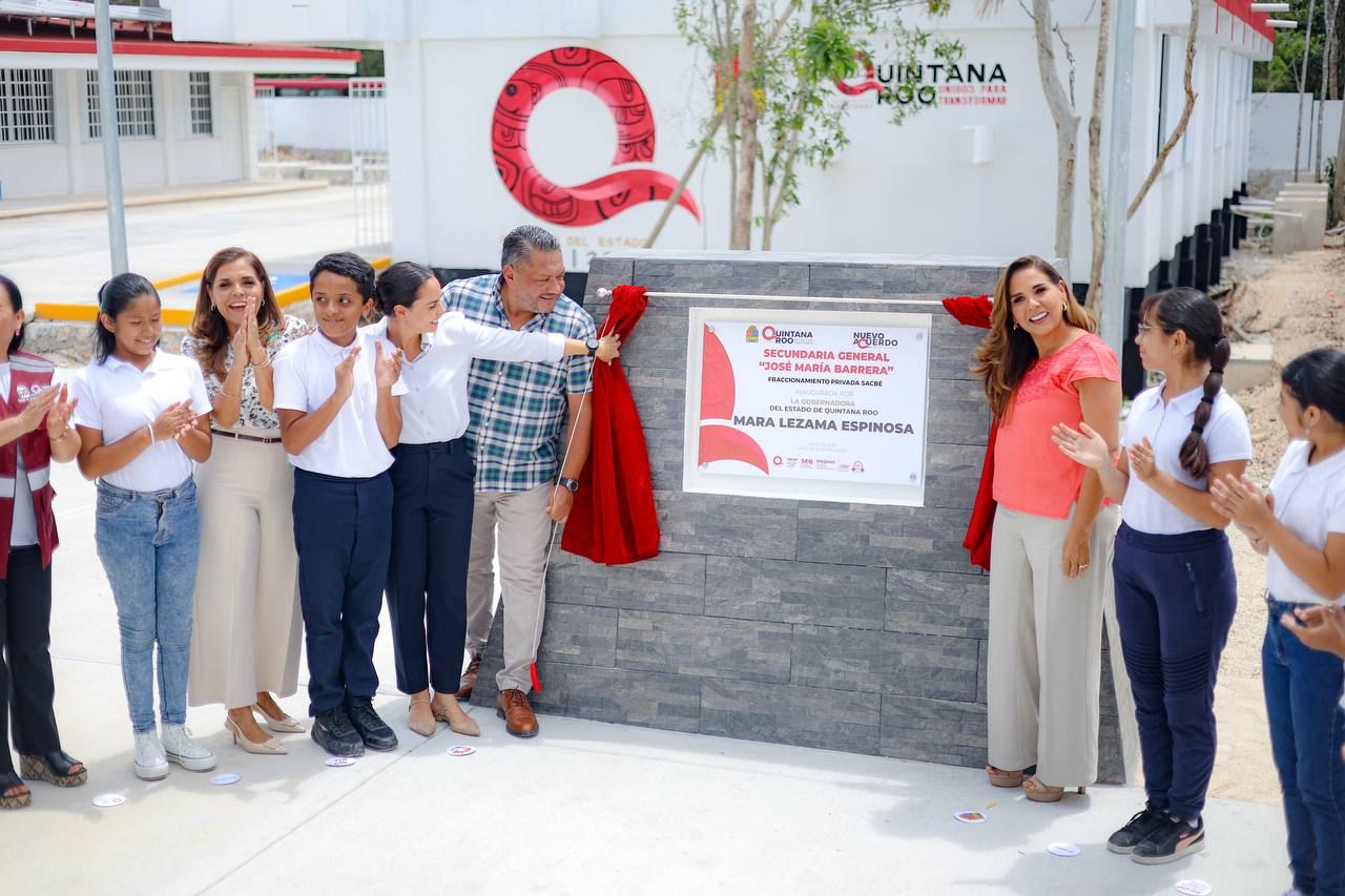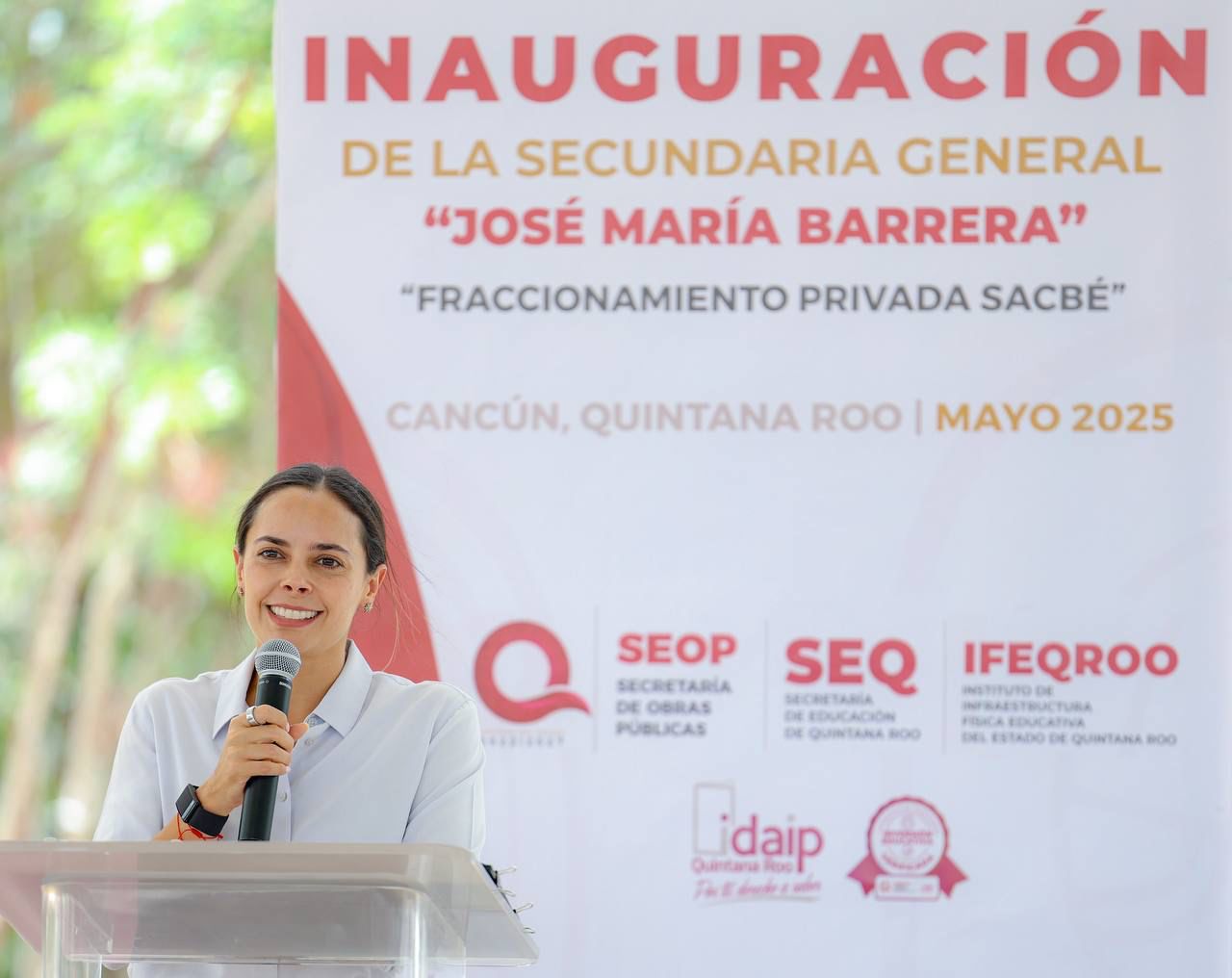 Cancún, Q. R., a 21 de mayo de 2025.- Al participar en la inauguración de la secundaria general de nueva creación “José María Barrera”, ubicada en el fraccionamiento Privada Sacbé, la Presidenta Municipal, Ana Paty Peralta, celebró que este nuevo plantel escolar es reflejo del compromiso de la gobernadora Mara Lezama por los niños y jóvenes para que tengan una mejor calidad de vida.