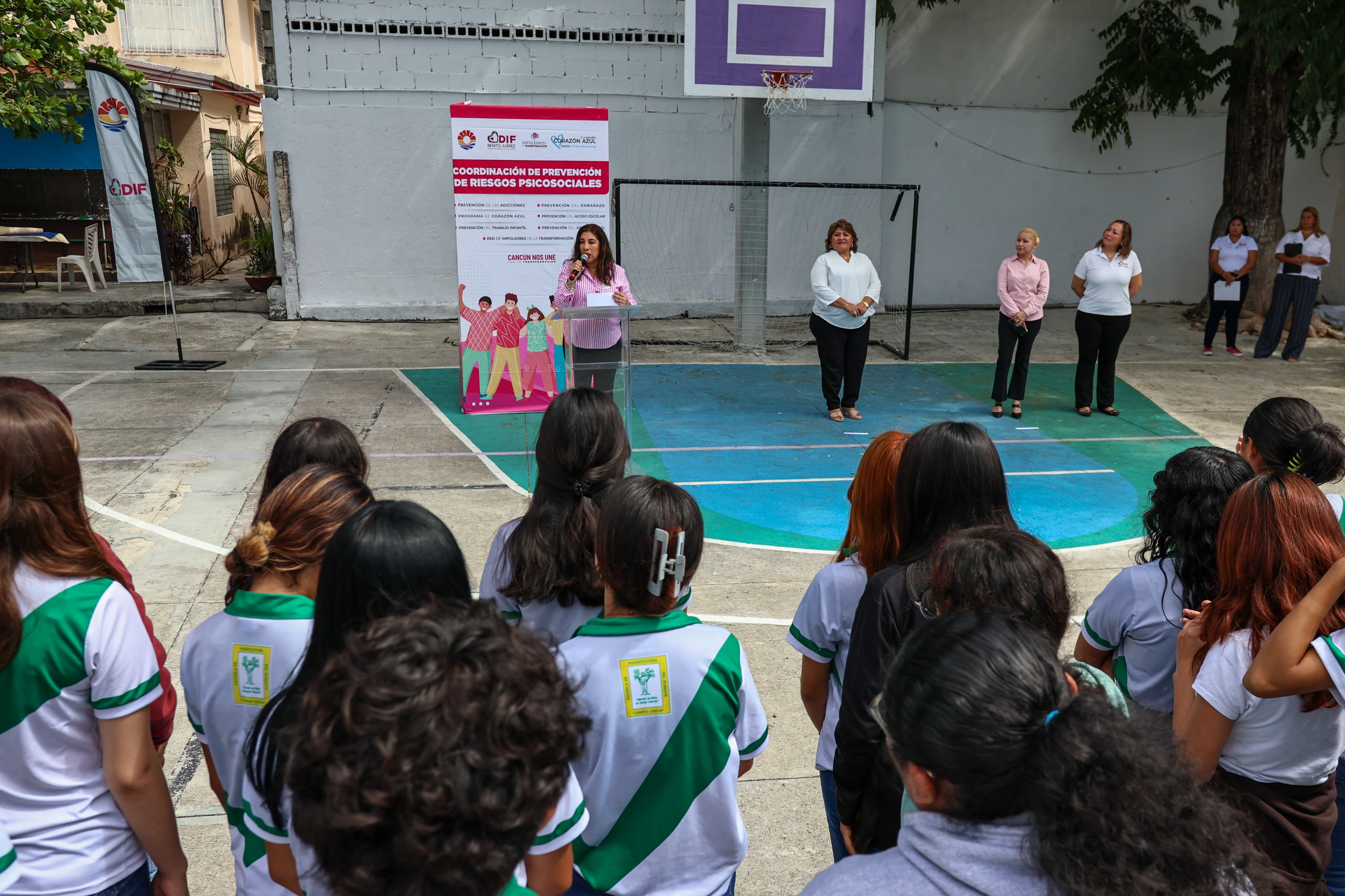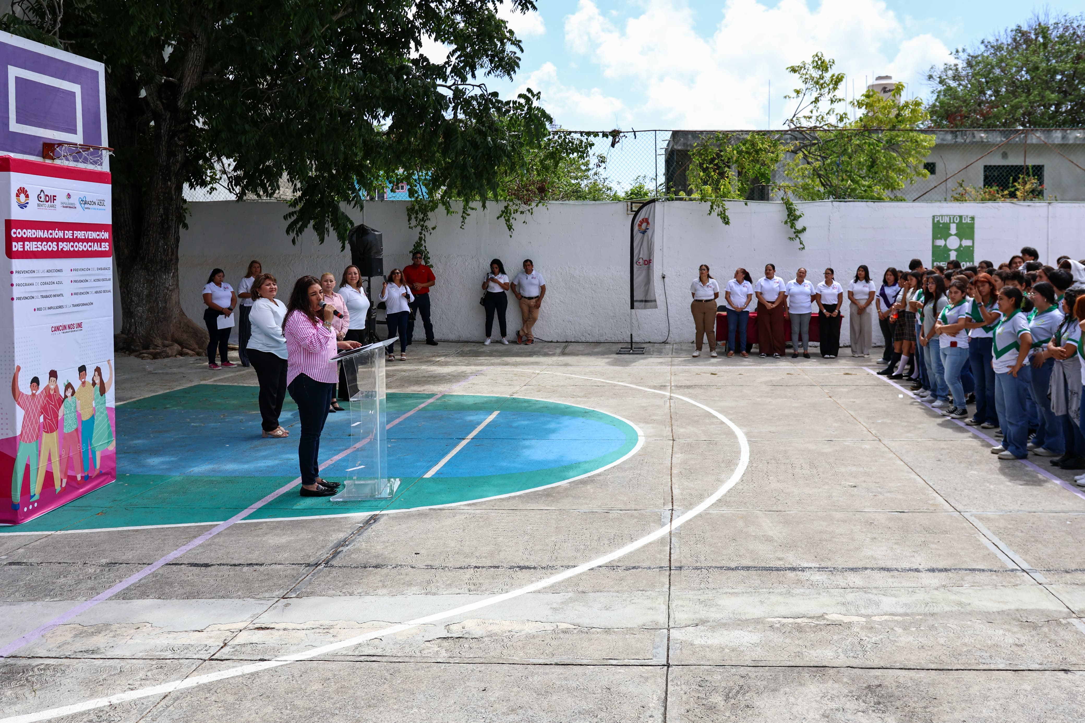La funcionaria municipal, al dirigir un mensaje a las alumnas y alumnos, expuso que “queremos escuelas seguras con espacios donde se pueda aprender, pero también donde se pueda ser uno mismo sin miedo. Para lograrlo, no basta con decir: Yo no acoso, yo no hago ‘bullying’; hay que ser parte activa del cambio, por eso venimos a decirles que no están solas, que no están solos”.