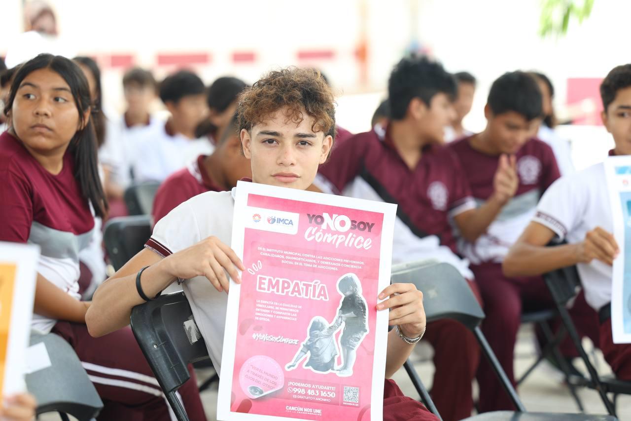 Como parte de las actividades a cargo del Instituto Municipal contra las Adicciones (IMCA), se llevó a cabo la colocación de señalética con la campaña de valores, pláticas de concientización sobre el tema, así como el mural “Yo no soy cómplice”, en el que los estudiantes plasmaron las huellas de sus manos con pintura de colores, a lo que se sumó la Presidenta Municipal.