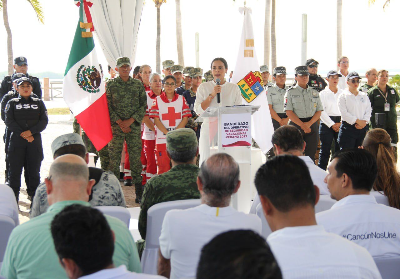 Cancún, Q. R., a 14 de julio de 2023.- “Una vez más, coordinaremos esfuerzos, a través de este nuevo modelo de Seguridad Ciudadana impulsado por la gobernadora Mara Lezama, para que en estas vacaciones tengamos saldo blanco, que sean placenteras y muy exitosas tanto para quienes vienen, como para quienes vivimos aquí, porque dependemos directa o indirectamente de esta gran industria que es el turismo”, resaltó la Presidenta Municipal, Ana Paty Peralta, en el banderazo del Operativo de Seguridad Vacacional Verano 2023.