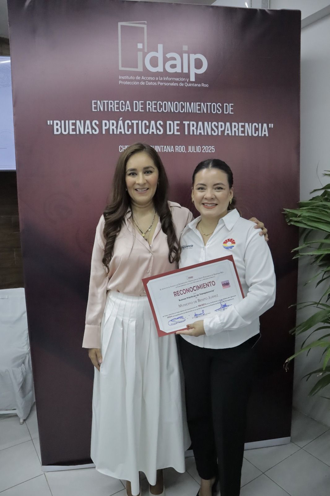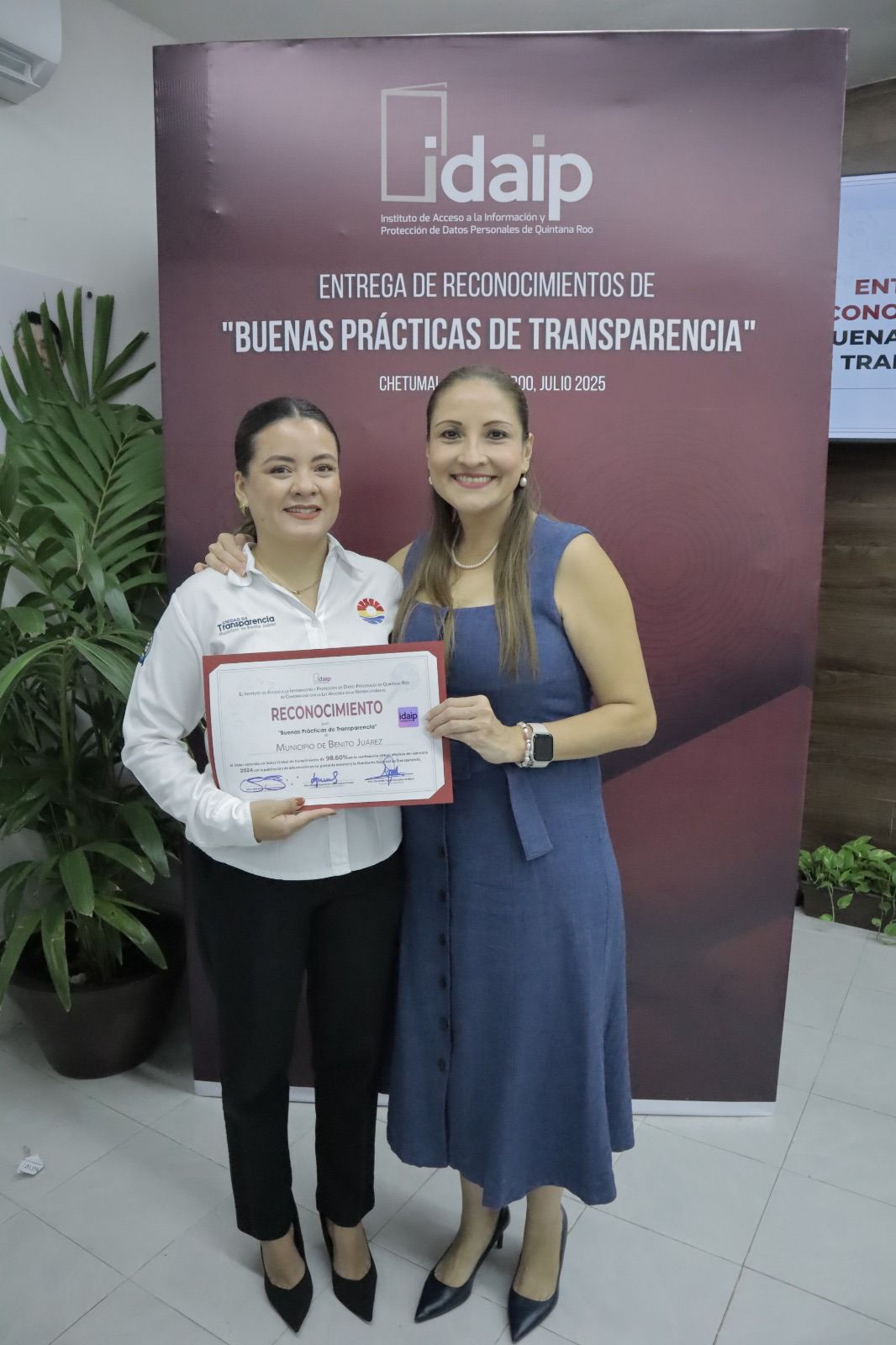 Chetumal, Q. R., a 02 de julio de 2025.- Con un puntaje histórico del 98.60%, en nombre de la Presidenta Municipal, Ana Paty Peralta, la directora de la Unidad de Transparencia, Monsserrath Milián Galera, recibió el reconocimiento de “Buenas prácticas de transparencia”, de manos de la comisionada del Instituto de Acceso a la Información y Protección de Datos Personales de Quintana Roo (IDAIPQROO), Magda Eugenia de Jesús Lozano Ocman.