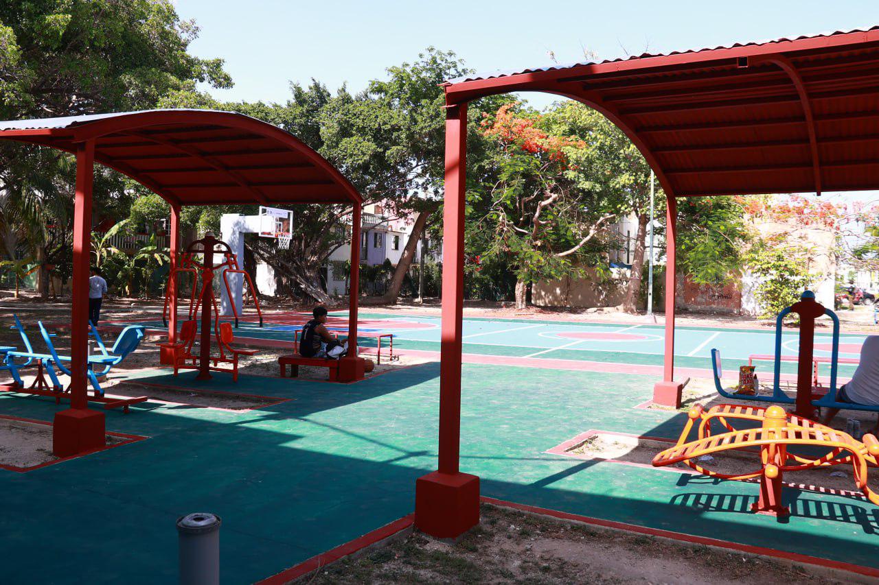 Como parte importante de la intervención, señaló, se pintó la cancha, se renovaron los tableros, se restauraron los juegos infantiles y ejercitadores (a los que se les construyó tinglados), además de labores de poda, limpieza, retiro de escombros, chapeo, jardinería, riego, plomería y herrería, acciones que se vieron retrasadas debido a las lluvias.