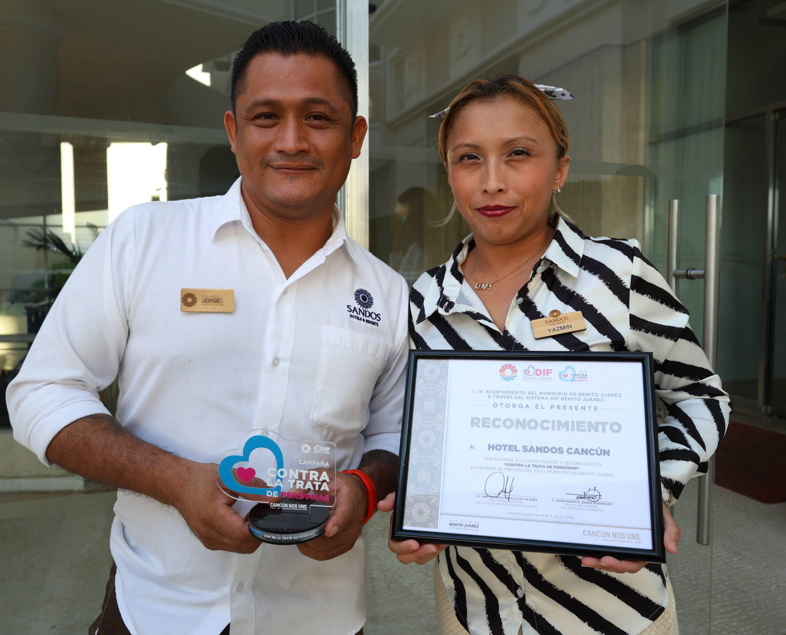 A su vez, la titular del Sistema DIF Benito Juárez, Marisol Sendo Rodríguez, subrayó que con este acto, el Hotel Sandos se suma a una lista creciente de organizaciones que ya han recibido el distintivo, consolidando el avance de una política pública que, desde octubre de 2024 a la fecha ha capacitado a mil 400 personas de empresas como: Hotel Dreams Cancún, Hotel Secrets The Vine, Ministros de culto y Cinépolis.