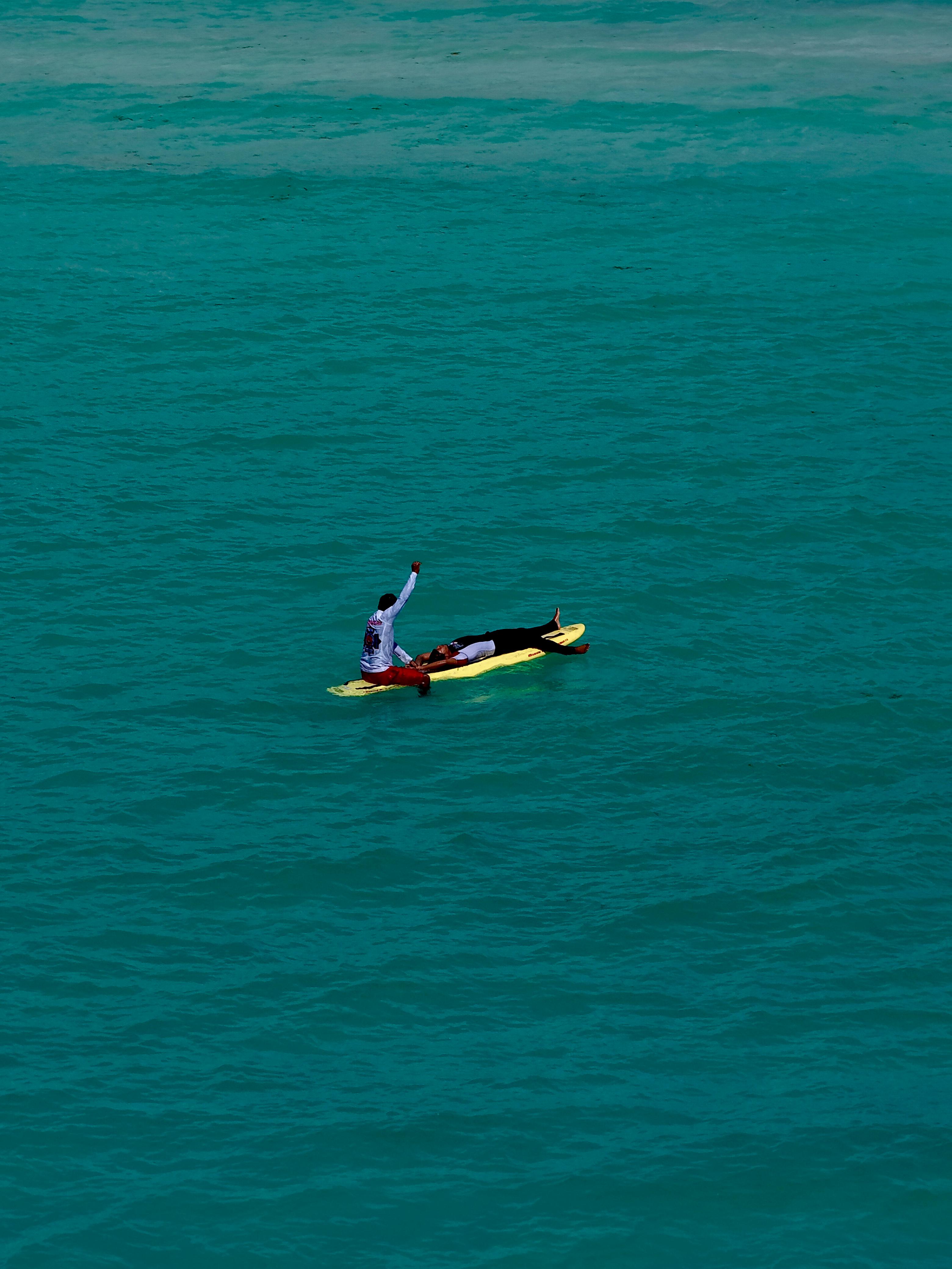 al agua con una tabla especializada para rescate y dos boyas a fin de