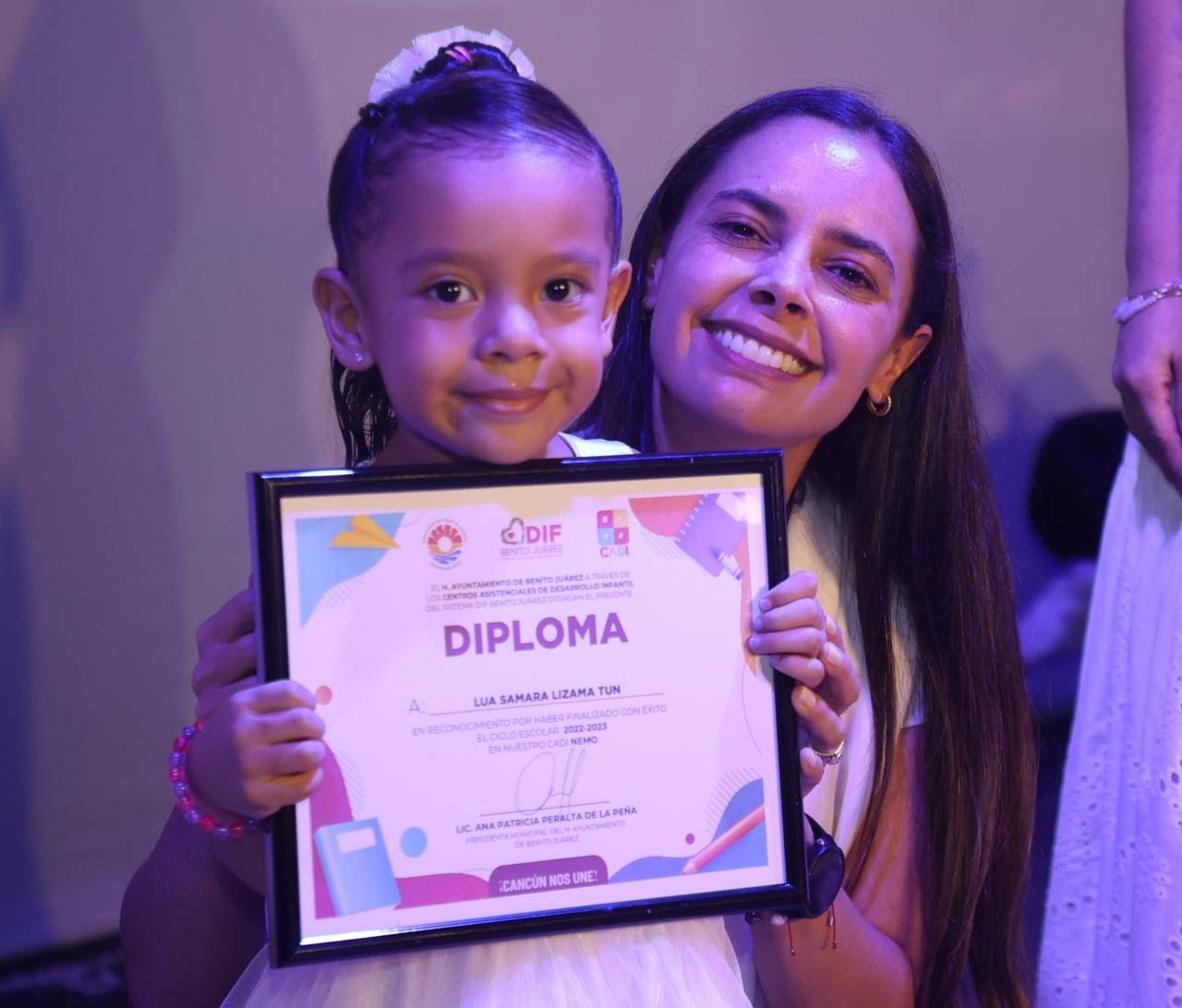 Cancún, Q. R., a 18 de julio de 2023.- La Presidenta Municipal, Ana Paty Peralta, entregó 24 diplomas de conclusión de los grados maternal, kínder 1 y kínder 2 a niñas y niños adscritos en los Centros Asistenciales de Desarrollo Infantil (CADI) que administra el Sistema para el Desarrollo de la Familia (DIF) Benito Juárez.