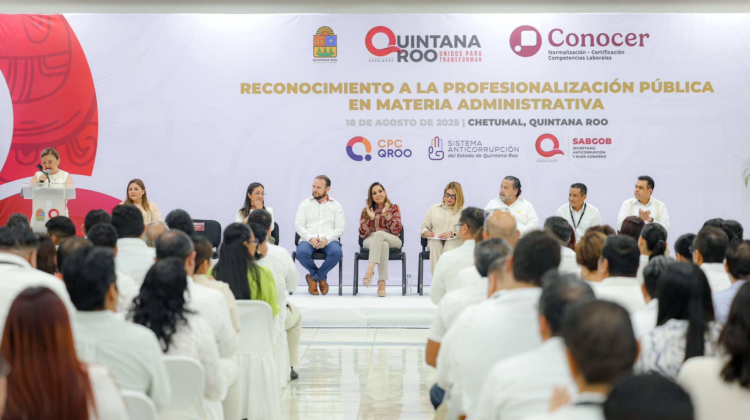 En el marco del evento realizado en la capital del estado, Ana Paty Peralta destacó que el distintivo para Benito Juárez fue recibido por personal de Ingresos y de la Contraloría Municipal, de manos de la gobernadora Mara Lezama, luego de haber logrado la certificación en el Estándar de Competencia EC1556: “Realización de Acciones de Investigación de Responsabilidad de Faltas Administrativas”, a través del Consejo Nacional de Normalización y Certificación de Competencias Laborales (CONOCER).