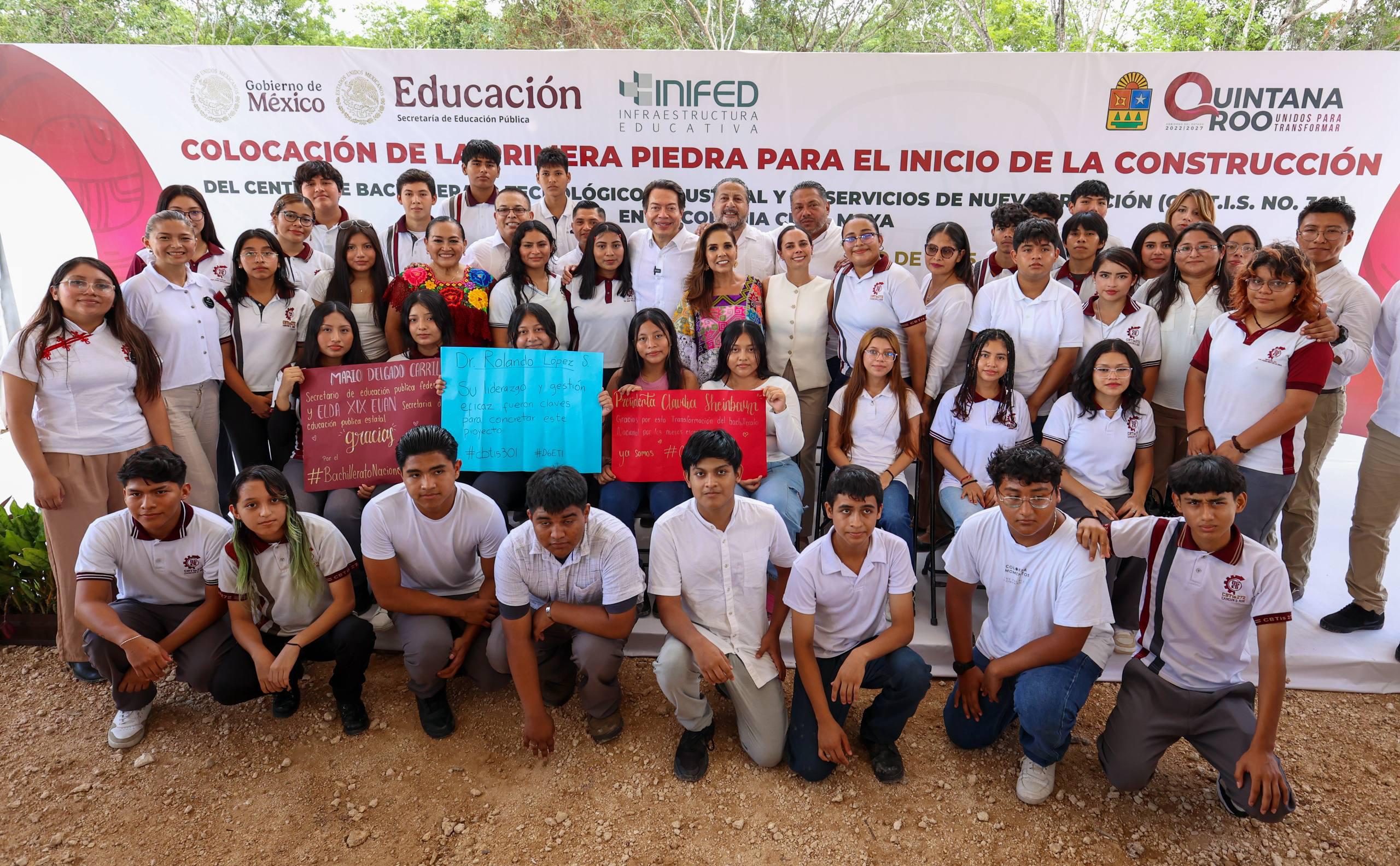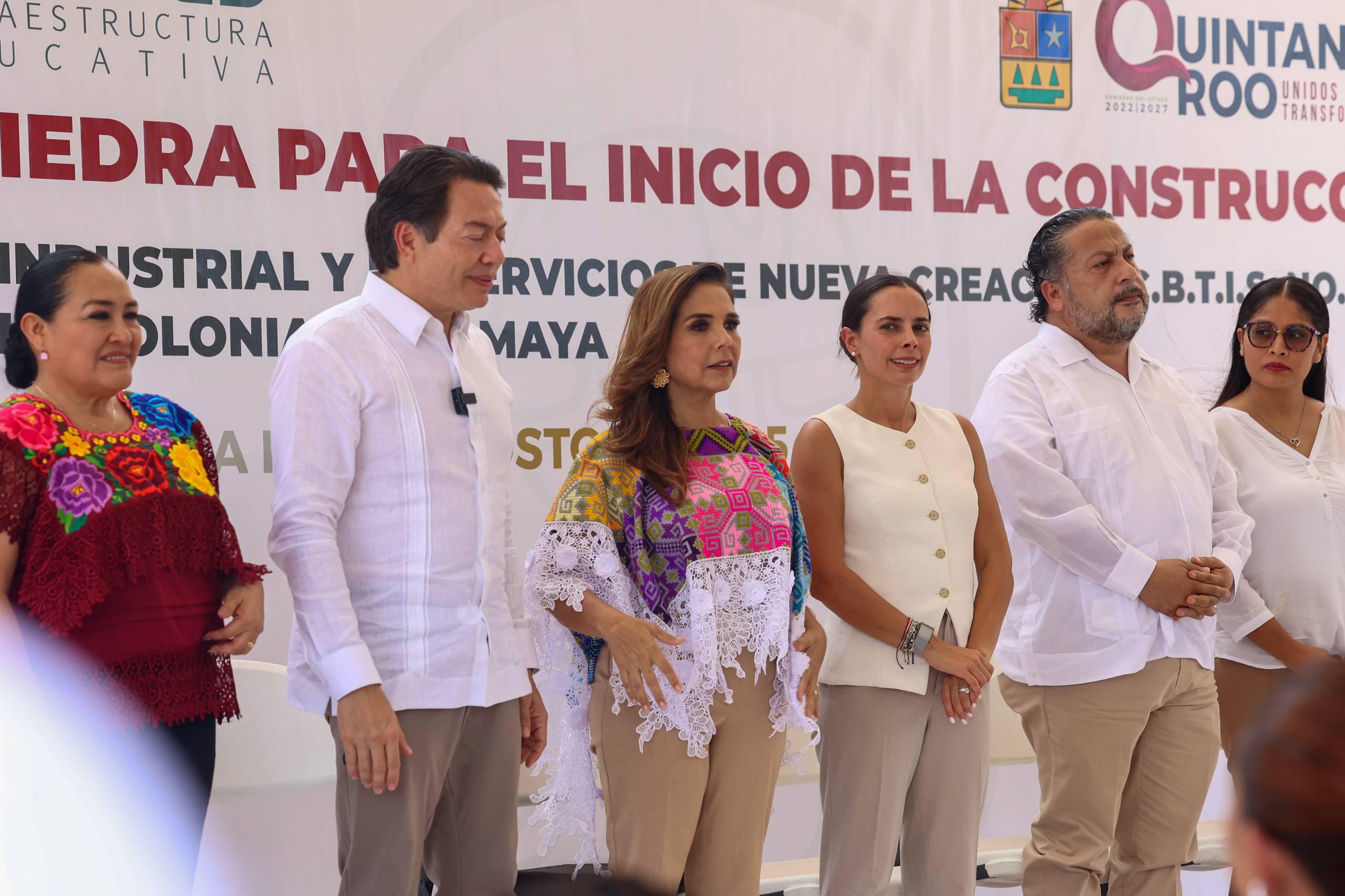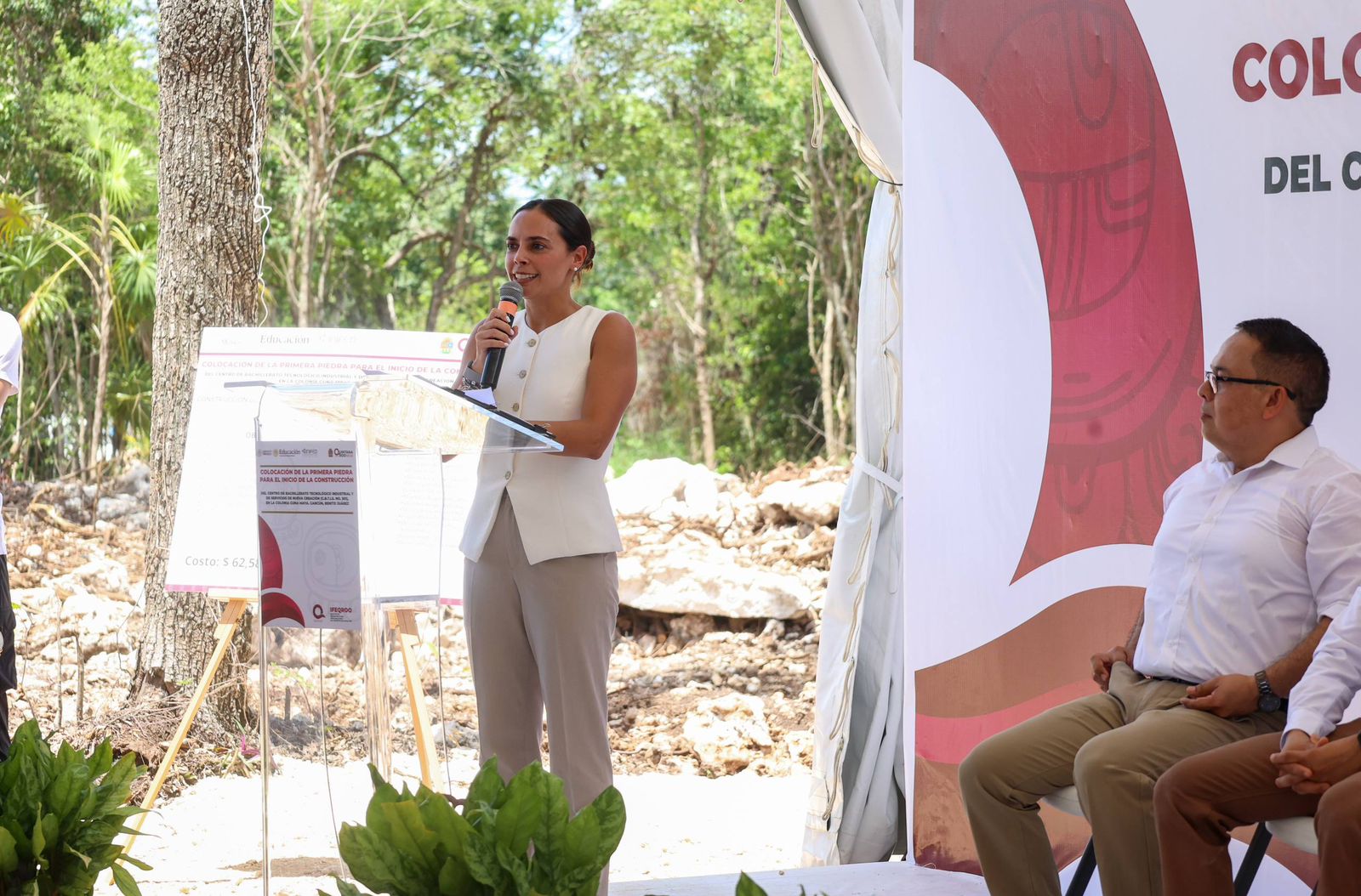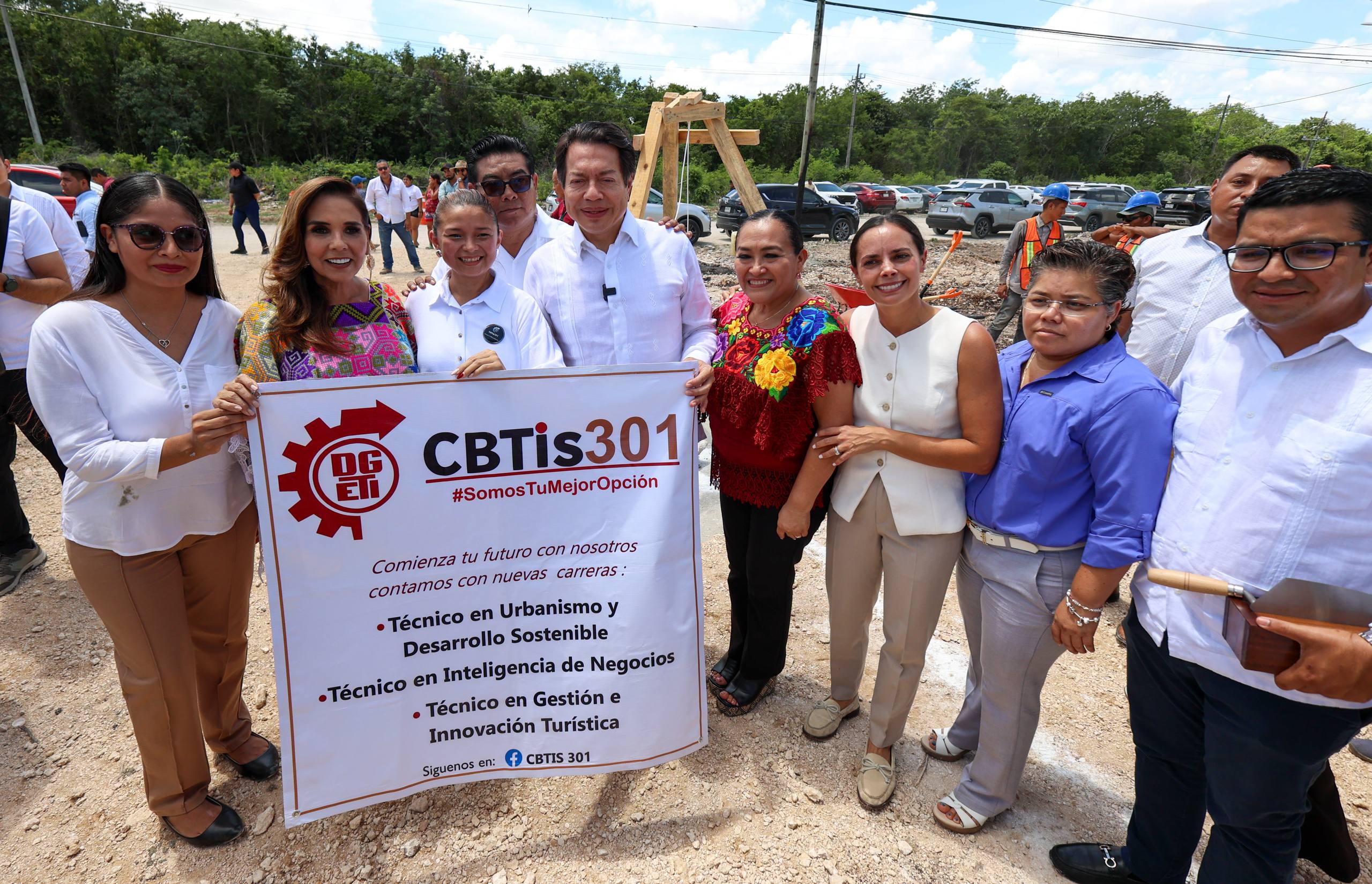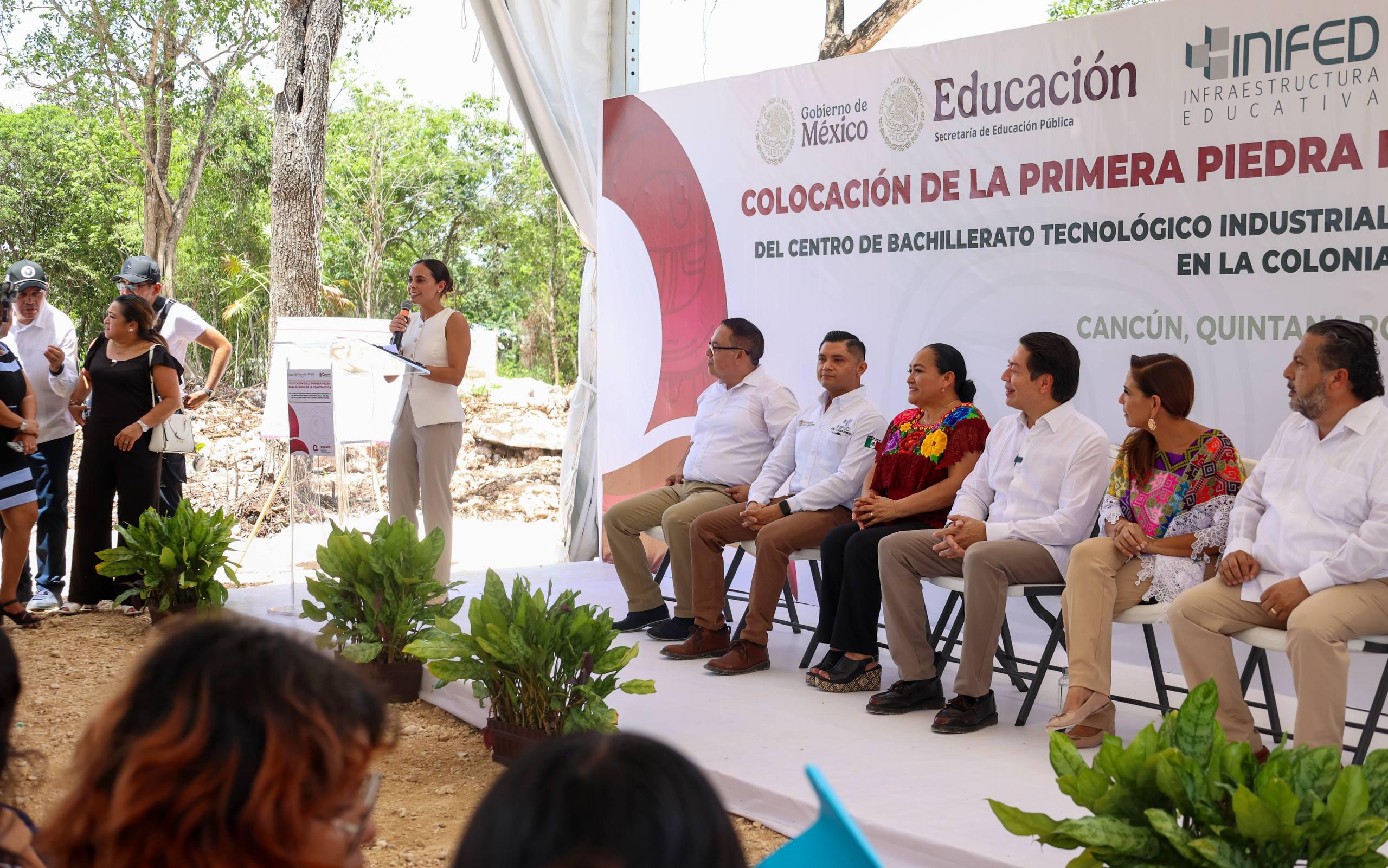 Cancún, Q. R., a 22 de agosto de 2025.- La Presidenta Municipal, Ana Paty Peralta, participó en la colocación de la primera piedra para el inicio de la construcción del Centro de Bachillerato Tecnológico Industrial y de Servicios de nueva creación (C.B.T.I.S. No. 301), en la colonia Cuna Maya, que tendrá una capacidad de hasta 900 alumnos en dos turnos.