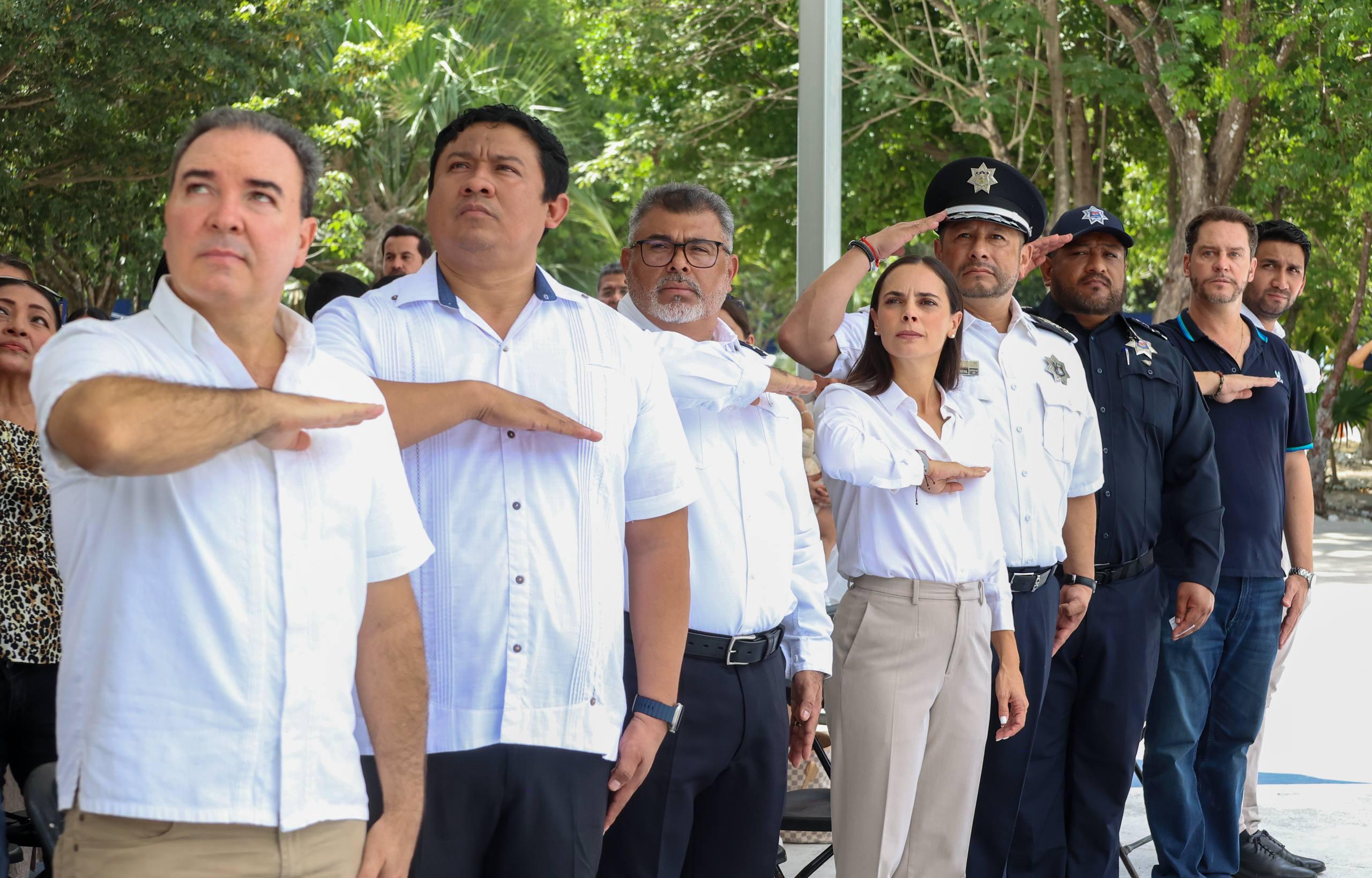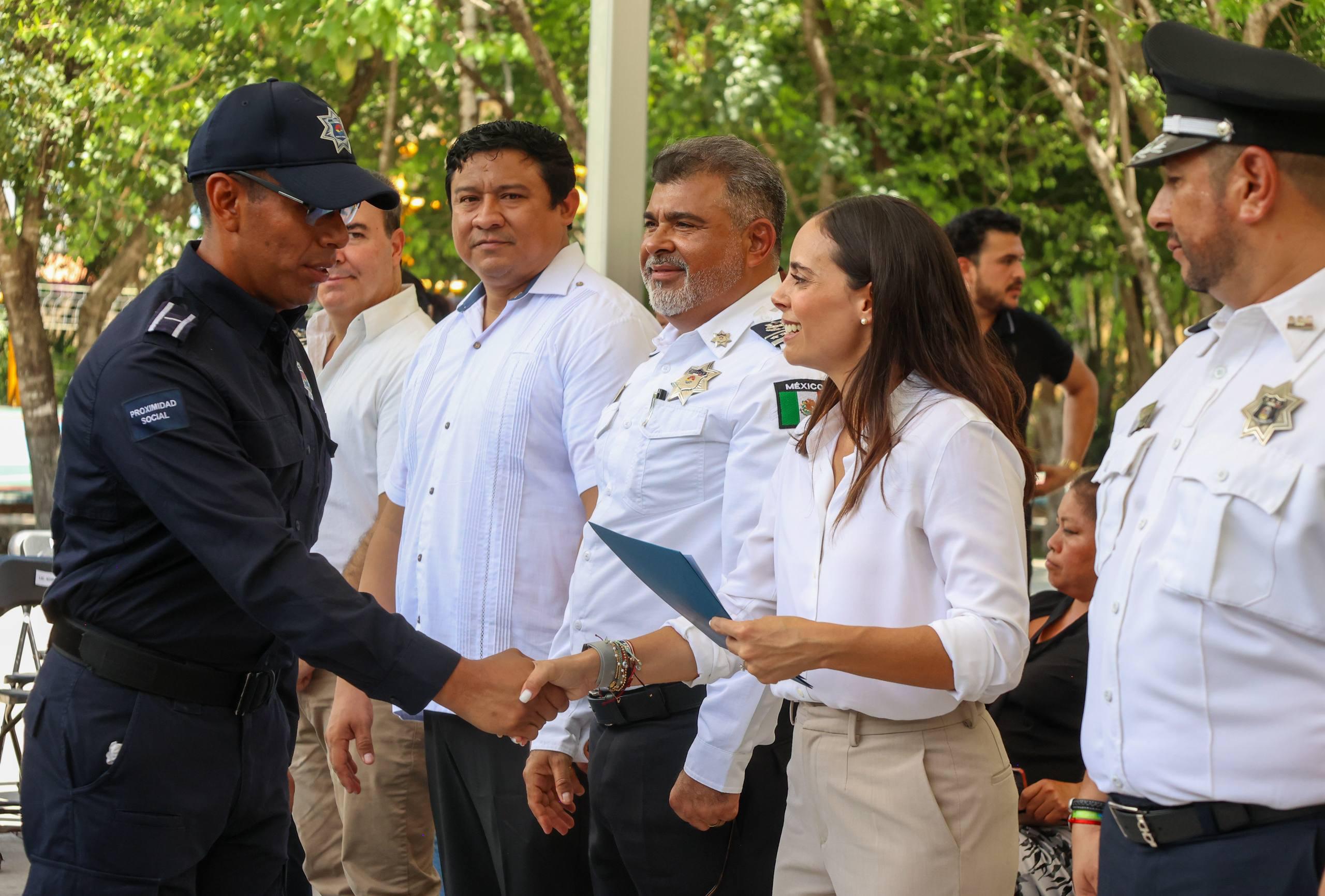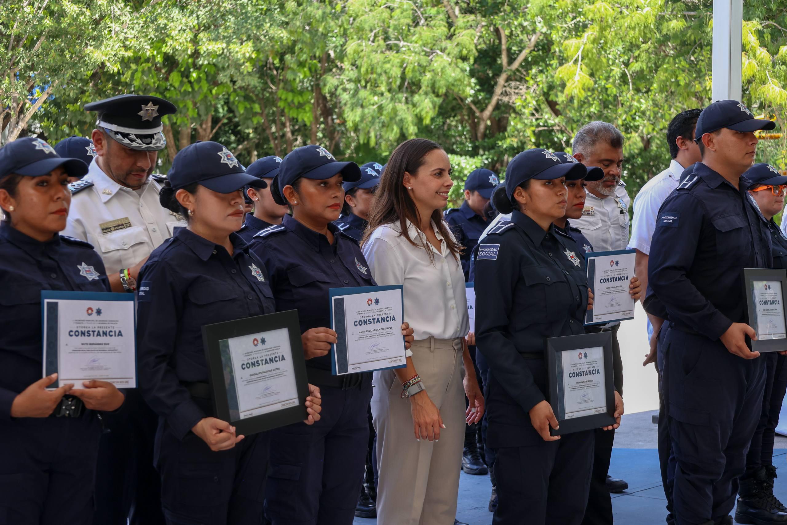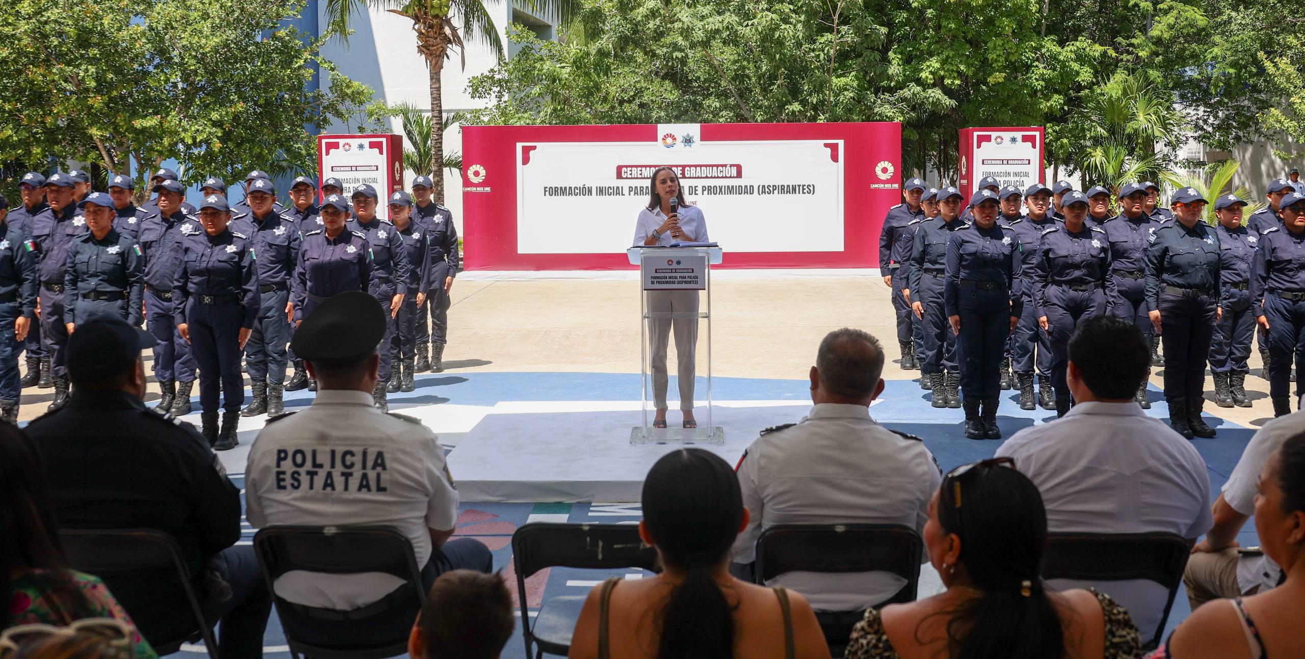 En el evento, al que asistieron familiares de los nuevos policías, la Alcaldesa reconoció que 27 de los egresados son mujeres. “Estamos transformando nuestra perspectiva de género, con mujeres valientes y firmes; es fruto de una estrategia integral liderada por nuestra presidenta, Claudia Sheinbaum Pardo, nuestra primera mujer Presidenta de México, respaldada desde el gobierno del estado, nuestra primera mujer gobernadora Mara Lezama, ahora ustedes son parte de esta estrategia, pero lo más valioso es la conducta y el compromiso de cada policía”, dijo.