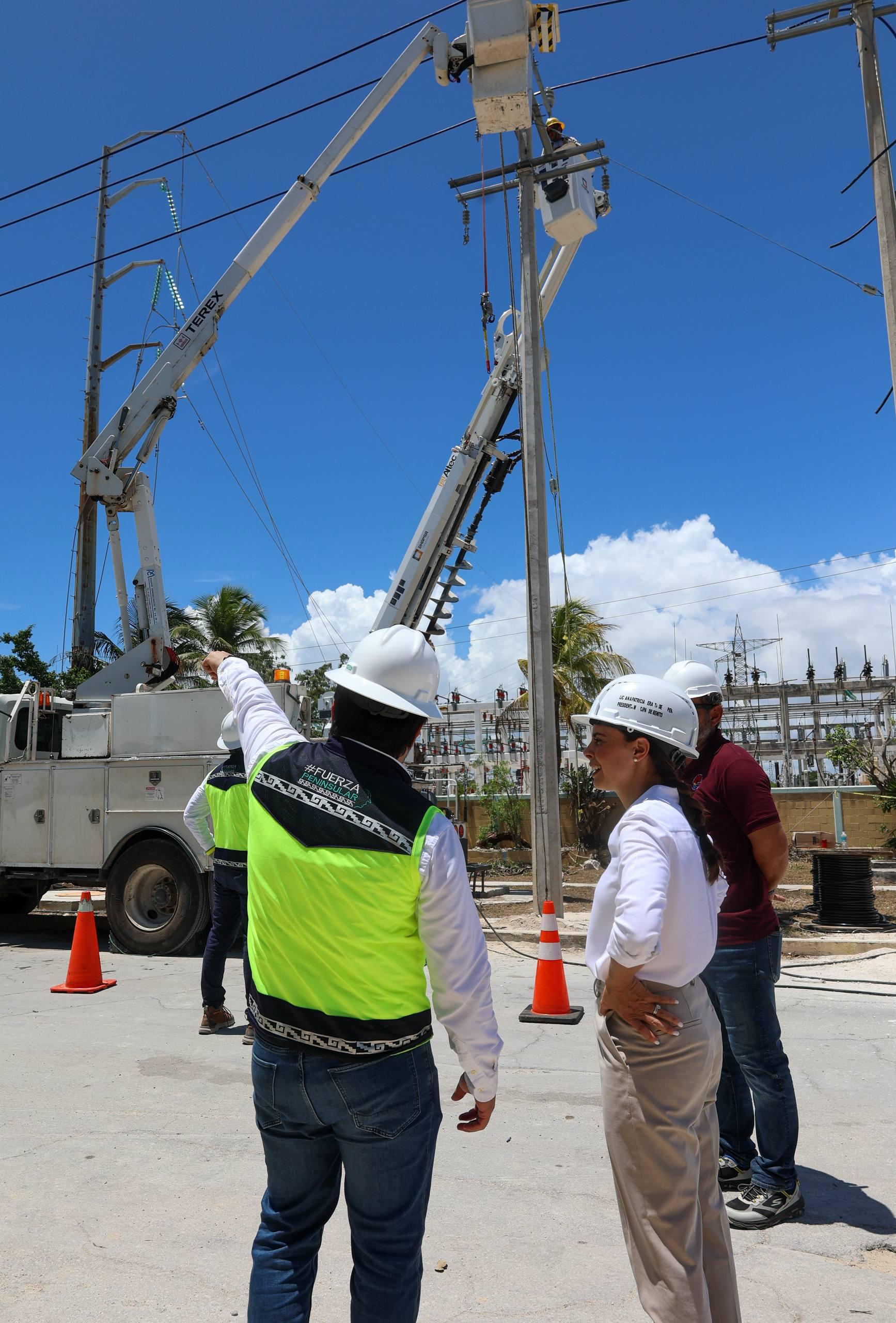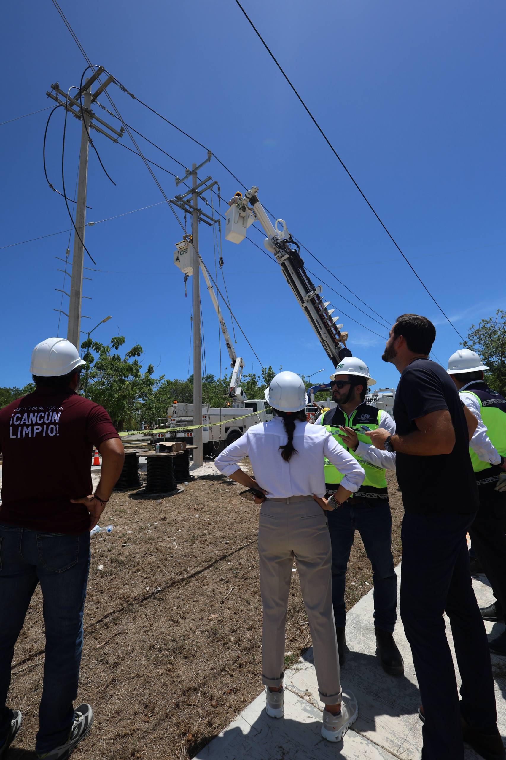 Acompañada por el gerente de División Peninsular de la CFE Distribución, Héctor Aguilar Valenzuela, la Primera Autoridad Municipal destacó que ante las interrupciones en el suministro de energía eléctrica en diversas zonas de la ciudad, sobre todo en Polígono Sur, se ha tenido comunicación con el superintendente de la CFE en la Zona Norte Cancún, Héctor Raúl Pérez Arjona y personal de la empresa, para solucionar esta problemática, por lo que agradeció el trabajo en equipo.