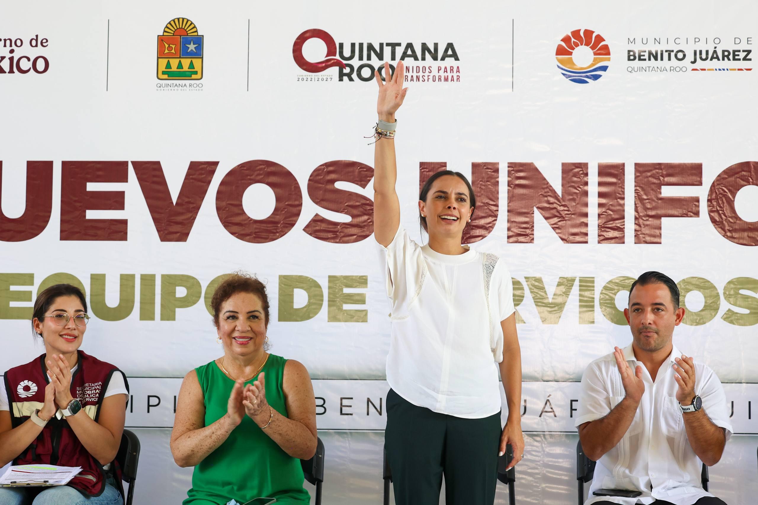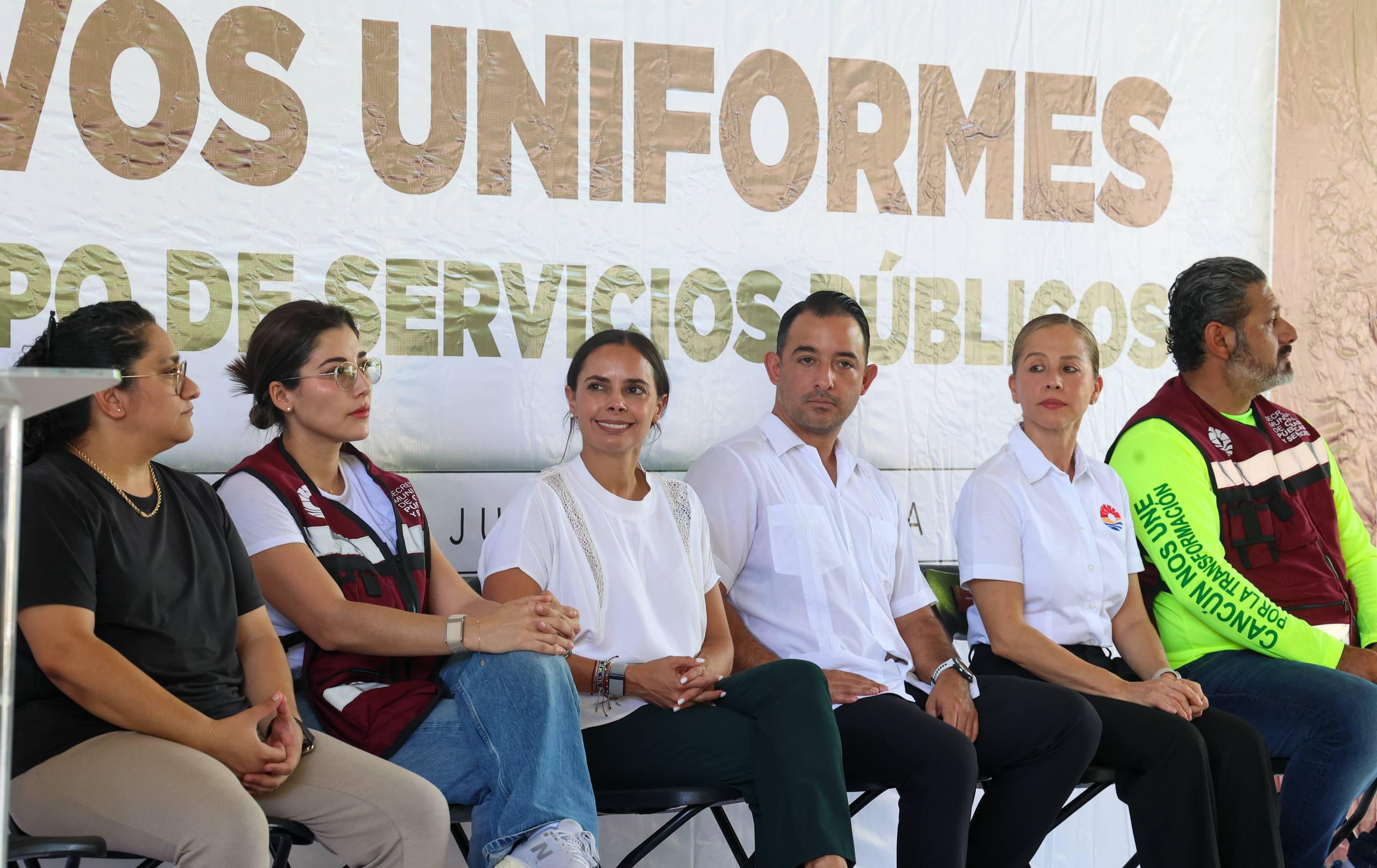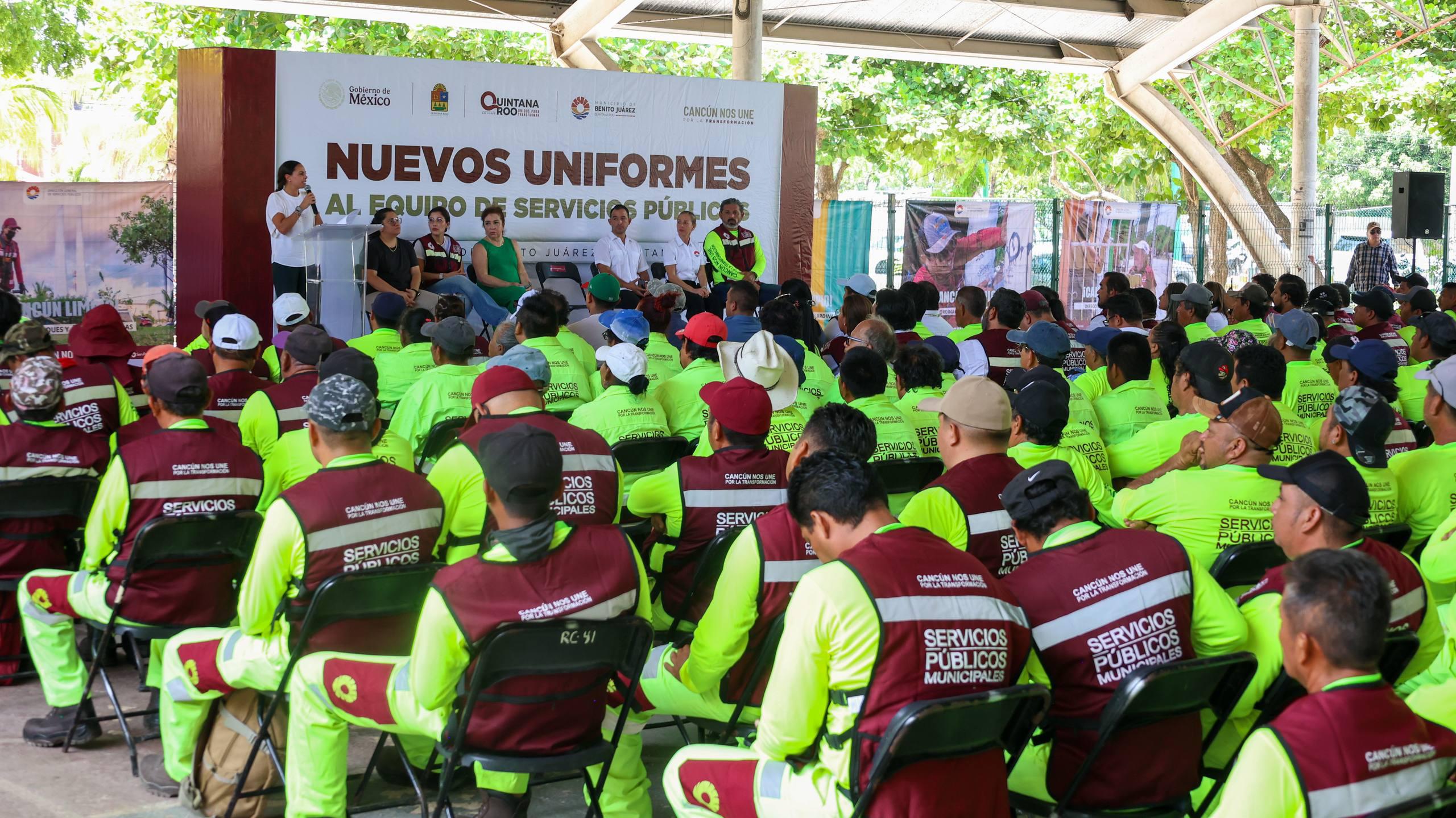 Cancún, Q. R., a 02 de septiembre de 2025.- Con el objetivo de reconocer el trabajo y fortalecer la identidad institucional y garantizar las condiciones adecuadas para el desempeño de sus labores, la Presidenta Municipal, Ana Paty Peralta, entregó uniformes para más de mil colaboradores de la Dirección de Servicios Públicos Municipales, a quienes les abasteció de pantalones, camisas, playeras dryfit, chalecos y botas.