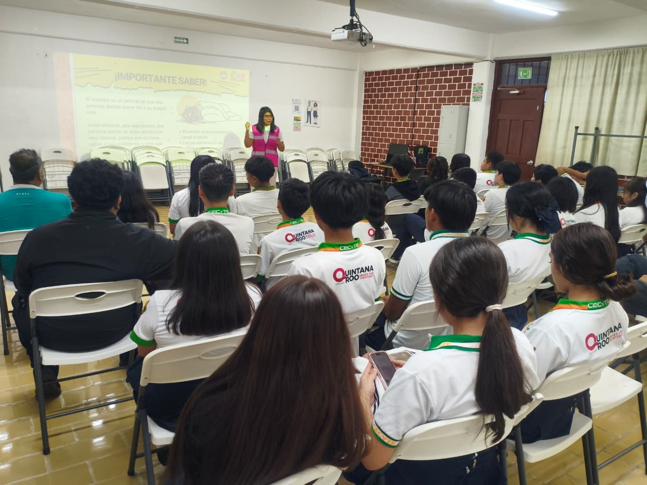 Cancún, Q. R., a 15 de septiembre de 2025.- El Sistema para el Desarrollo Integral de la Familia (DIF) Benito Juárez, a través de la dirección de Prevención de Riesgos Psicosociales de Niñas, Niños y Adolescentes (DIPRINNA), impartió pláticas de prevención del suicidio a alumnas y alumnos del Colegio de Estudios Científicos y Tecnológicos (CECyTE) plantel III, en el marco del Día Mundial para la Prevención del Suicidio.