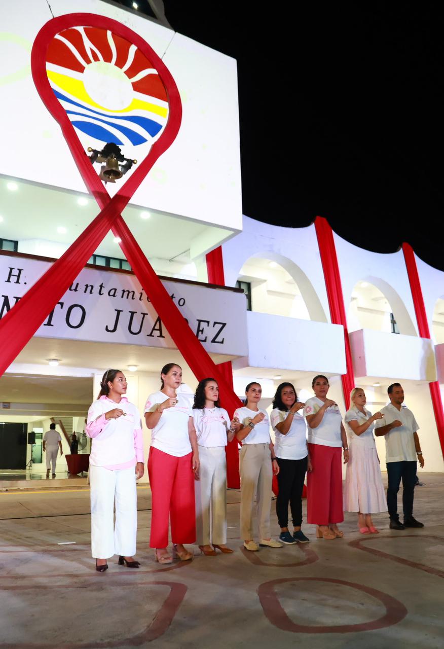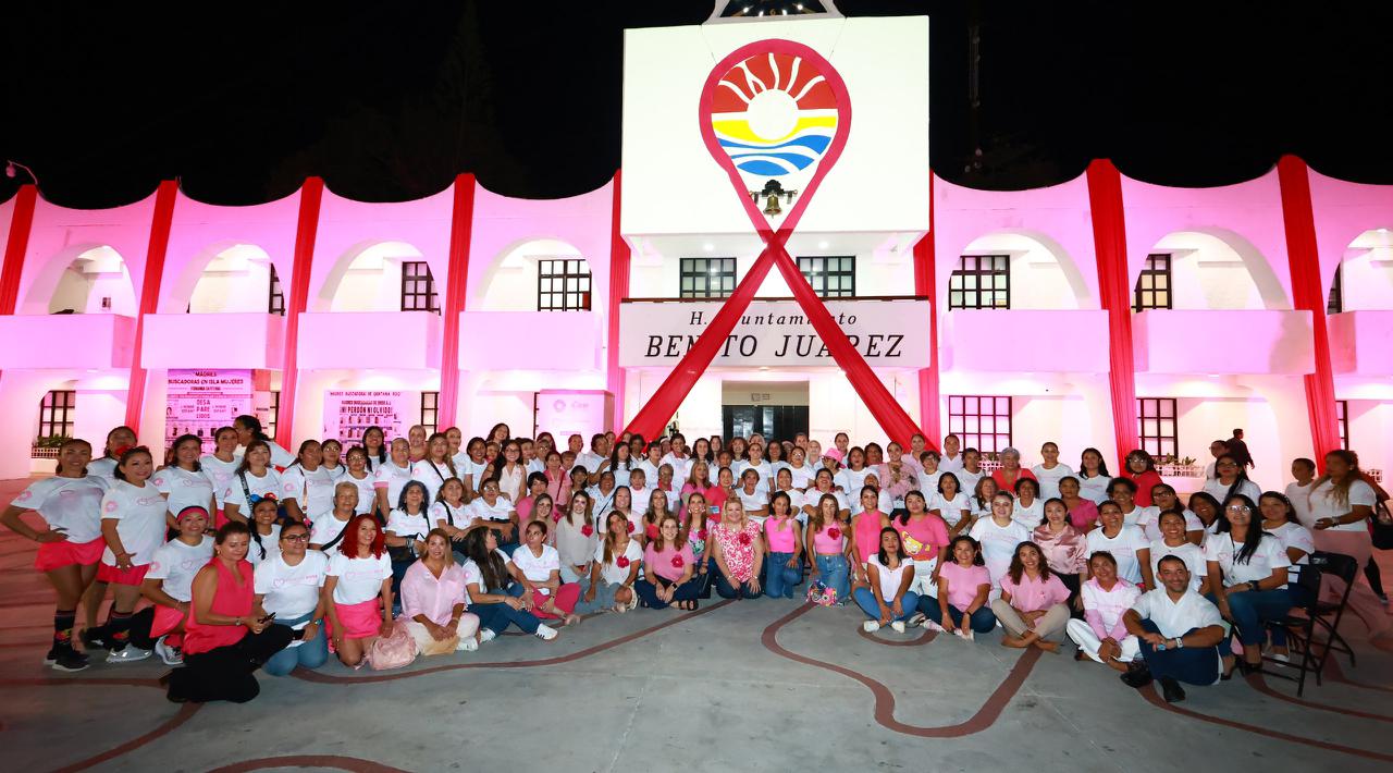 Sin embargo, uno de los momentos más significativos fue el encendido del Palacio Municipal en un vibrante color rosa, iluminando la noche como un símbolo de esperanza, lucha y conciencia sobre la salud de las cancunenses.