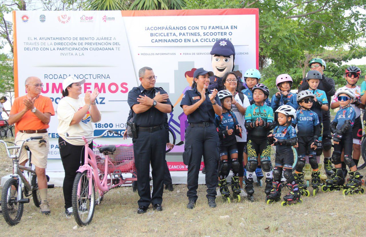 Cancún, Q. R., a 25 de julio de 2023.- A fin de promover el deporte y fortalecer lazos familiares a través de la sana convivencia, el secretario municipal de Seguridad Pública y Tránsito, José Pablo Mathey Cruz, en representación de la Presidenta Municipal de Benito Juárez, Ana Paty Peralta, encabezó el contingente de más de 60 niños, jóvenes y padres de familias quienes circularon con bicicletas, patines y patinetas sobre avenidas principales de la ciudad, en la segunda rodada nocturna “Iluminemos la Paz”.