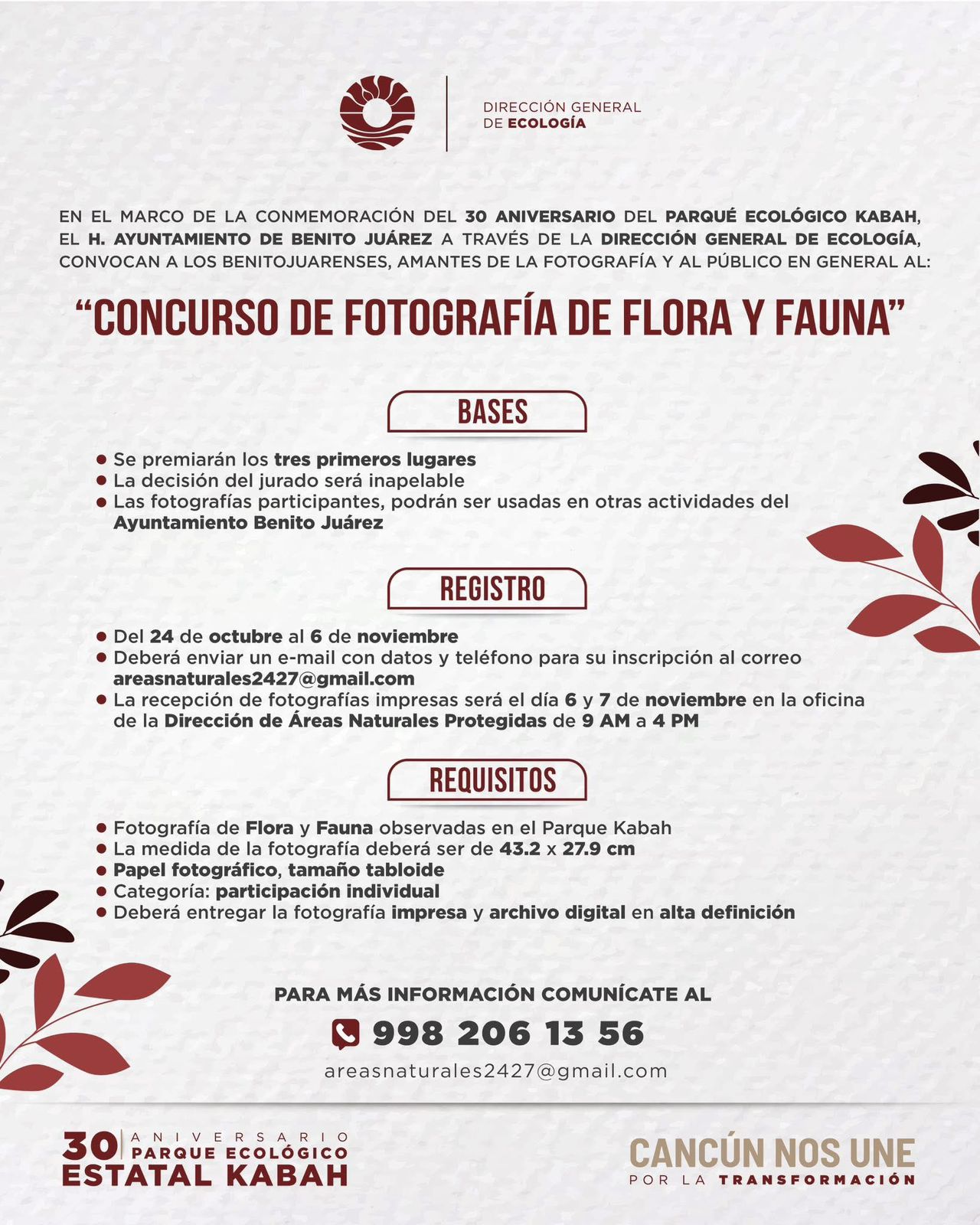 Cancún, Q. R., a 28 de octubre de 2025.- Autoridades del Ayuntamiento de Benito Juárez, a través de la Dirección General de Ecología, invitan a participar a las y los ciudadanos en el Concurso de Fotografía de Flora y Fauna, para celebrar el 30° aniversario del Parque Ecológico Kabah.
